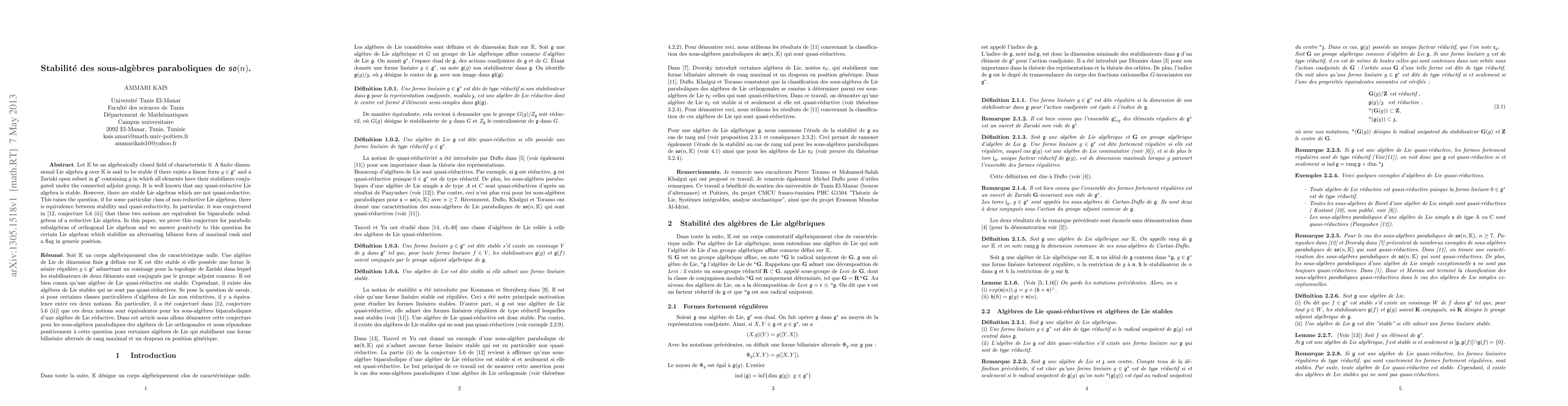 Let $\mathbb{K}$ be an algebraically closed field of characteristic 0. A finite dimensional Lie algebra $\mathfrak{g}$ over $\mathbb{K}$ is said to be stable if there exists a linear form $g\in\mathfrak{g}^{*}$ and a Zariski open subset in $\mathfrak{g}^{*}$ containing $g$ in which all elements have their stabilizers conjugated under the connected adjoint group. It is well known that any quasi-reductive Lie algebra is stable. However, there are stable Lie algebras which are not quasi-reductive. This raises the question, if for some particular class of non-reductive Lie algebras, there is equivalence between stability and quasi-reductivity. In particular, it was conjectured by Panyushev that these two notions are equivalent for biparabolic subalgebras of a reductive Lie algebra. In this paper, we prove this conjecture for parabolic subalgebras of orthogonal Lie algebras and we answer positively to this question for certain Lie algebras which stabilize an alternating bilinear form of maximal rank and a flag in generic position.