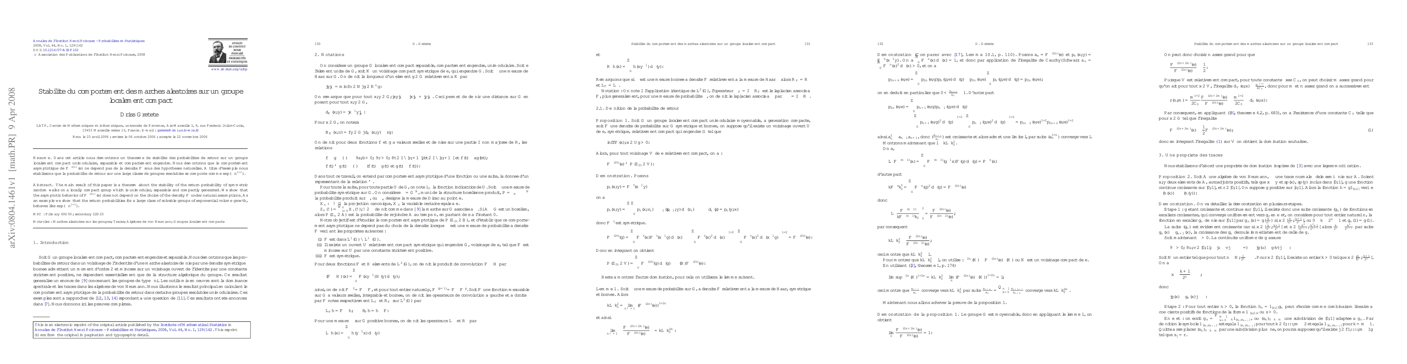 Dans cet article nous d\'{e}montrons un th\'{e}or\`{e}me de stabilit\'{e} des probabilit\'{e}s de retour sur un groupe localement compact unimodulaire, s\'{e}parable et compactement engendr\'{e}. Nous d\'{e}montrons que le comportement asymptotique de $F^{*(2n)}(e)$ ne d\'{e}pend pas de la densit\'{e} $F$ sous des hypoth\`{e}ses naturelles. A titre d'exemple nous \'{e}tablissons que la probabilit\'{e} de retour sur une large classe de groupes r\'{e}solubles se comporte comme $\exp(-n^{1/3})$.