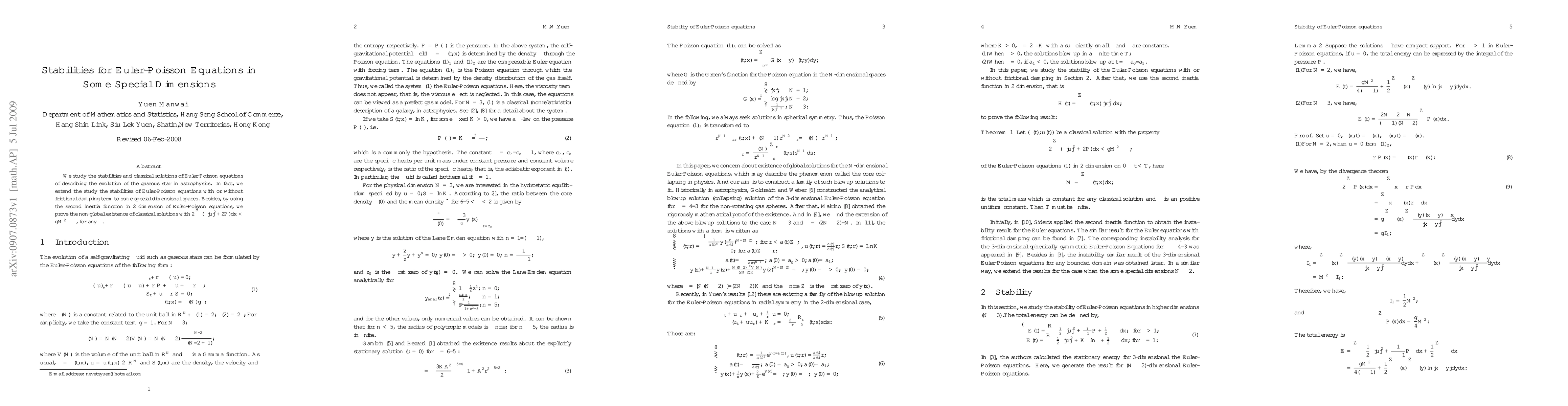 This paper investigates the stability and existence of classical solutions for Euler-Poisson equations modeling gaseous star evolution, extending the analysis to special dimensional spaces with and without damping terms. It also proves non-global existence of classical solutions under certain conditions using the second inertia function in 2 dimensions.