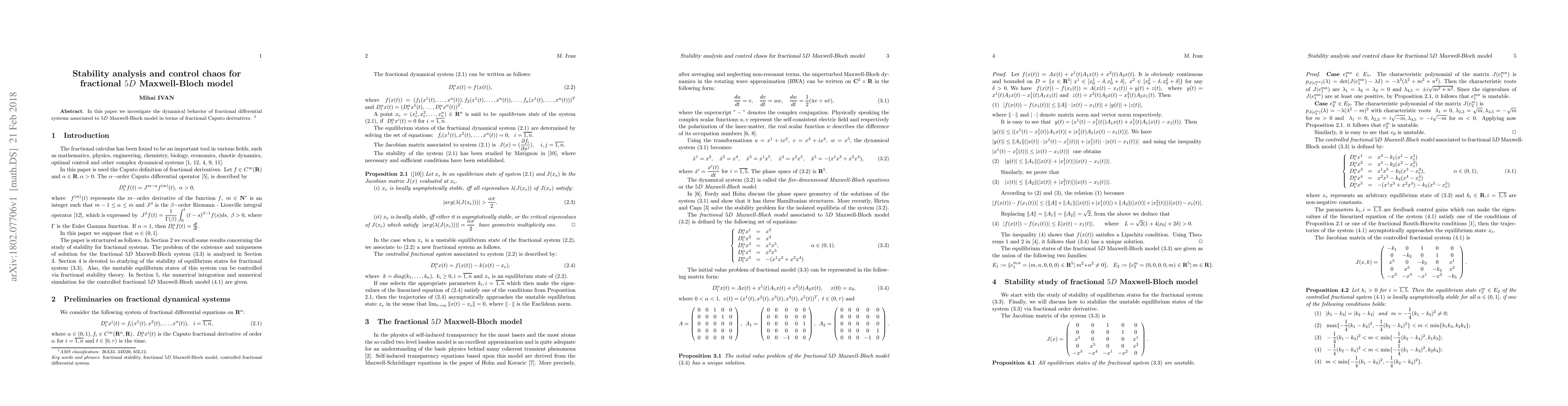 Summary: This paper examines the dynamical behavior and chaos control of a fractional differential system linked to a 5D Maxwell-Bloch model, utilizing fractional Caputo derivatives for stability analysis.