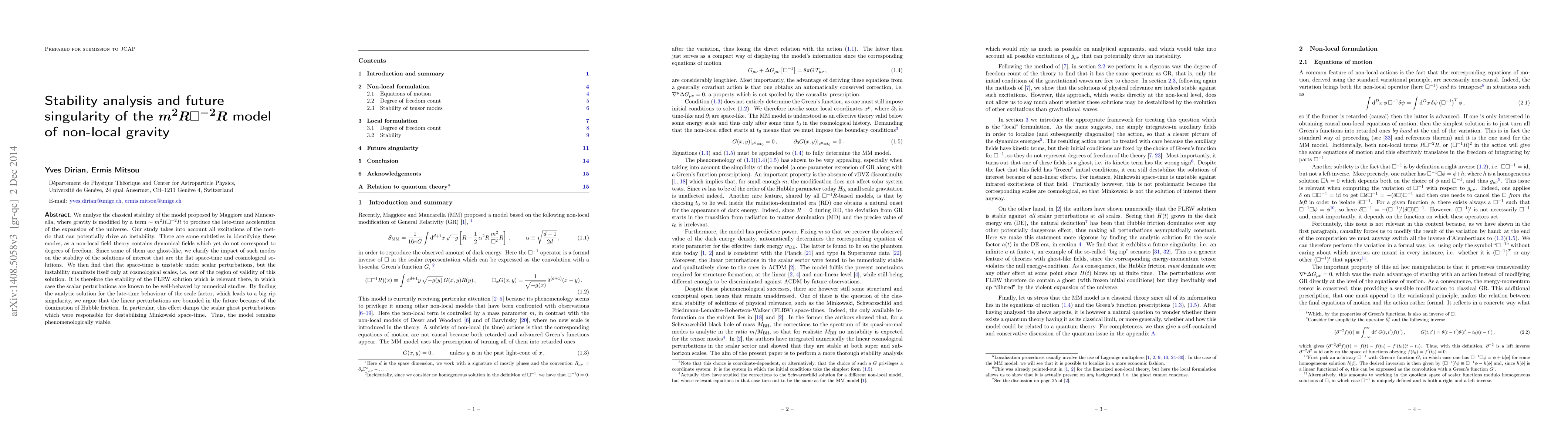 We analyse the classical stability of the model proposed by Maggiore and Mancarella, where gravity is modified by a term $\sim m^2 R \Box^{-2} R$ to produce the late-time acceleration of the expansion of the universe. Our study takes into account all excitations of the metric that can potentially drive an instability. There are some subtleties in identifying these modes, as a non-local field theory contains dynamical fields which yet do not correspond to degrees of freedom. Since some of them are ghost-like, we clarify the impact of such modes on the stability of the solutions of interest that are the flat space-time and cosmological solutions. We then find that flat space-time is unstable under scalar perturbations, but the instability manifests itself only at cosmological scales, i.e. out of the region of validity of this solution. It is therefore the stability of the FLRW solution which is relevant there, in which case the scalar perturbations are known to be well-behaved by numerical studies. By finding the analytic solution for the late-time behaviour of the scale factor, which leads to a big rip singularity, we argue that the linear perturbations are bounded in the future because of the domination of Hubble friction. In particular, this effect damps the scalar ghost perturbations which were responsible for destabilizing Minkowski space-time. Thus, the model remains phenomenologically viable.