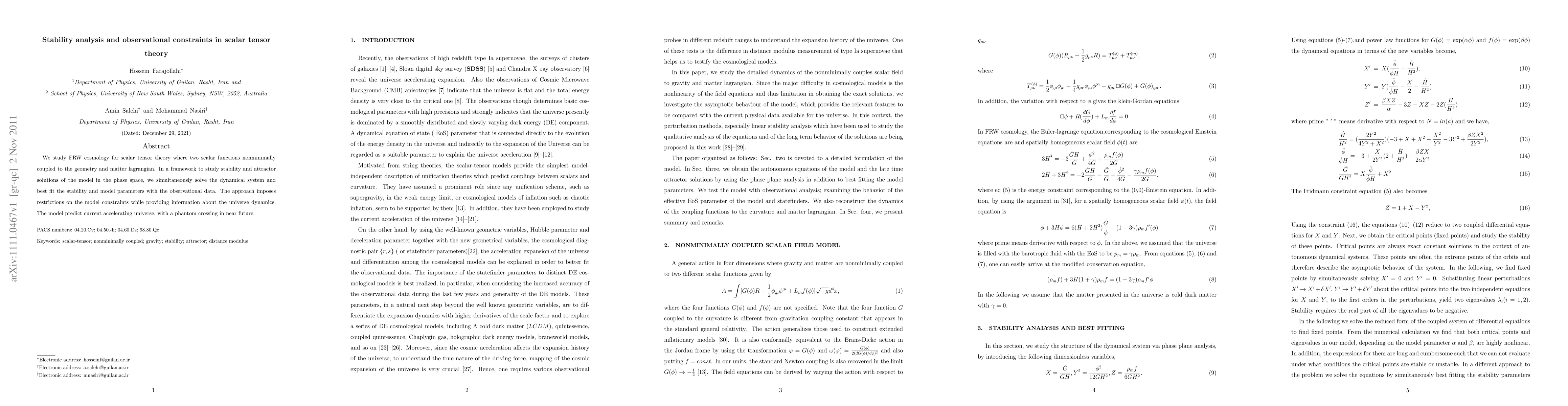This paper investigates the stability and observational constraints of scalar tensor theory in FRW cosmology, focusing on nonminimally coupled scalar functions. It employs dynamical systems analysis to explore attractor solutions and fits model parameters to observational data, revealing predictions of current cosmic acceleration and a phantom crossing in the near future.