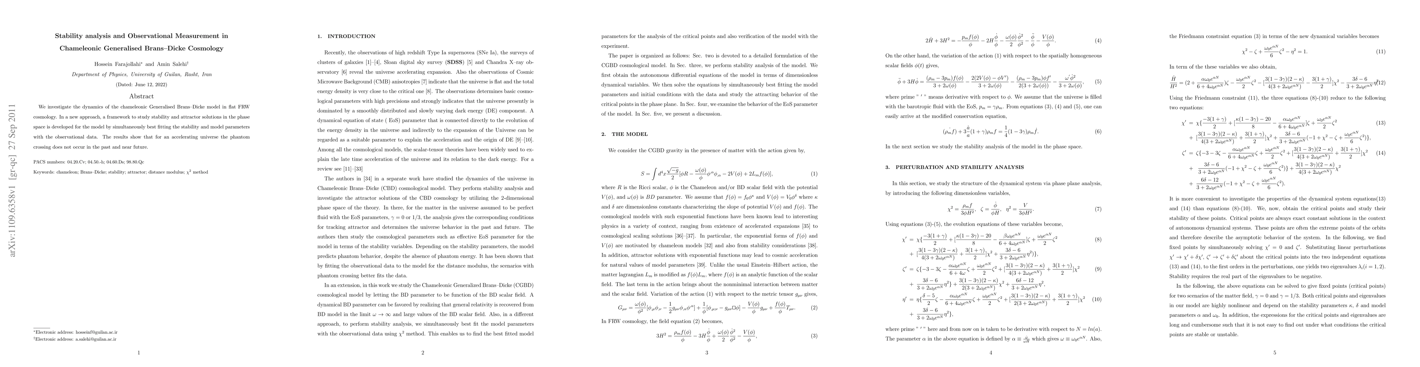 We investigate the dynamics of the chameleonic Generalised Brans--Dicke model in flat FRW cosmology. In a new approach, a framework to study stability and attractor solutions in the phase space is developed for the model by simultaneously best fitting the stability and model parameters with the observational data. The results show that for an accelerating universe the phantom crossing does not occur in the past and near future.
