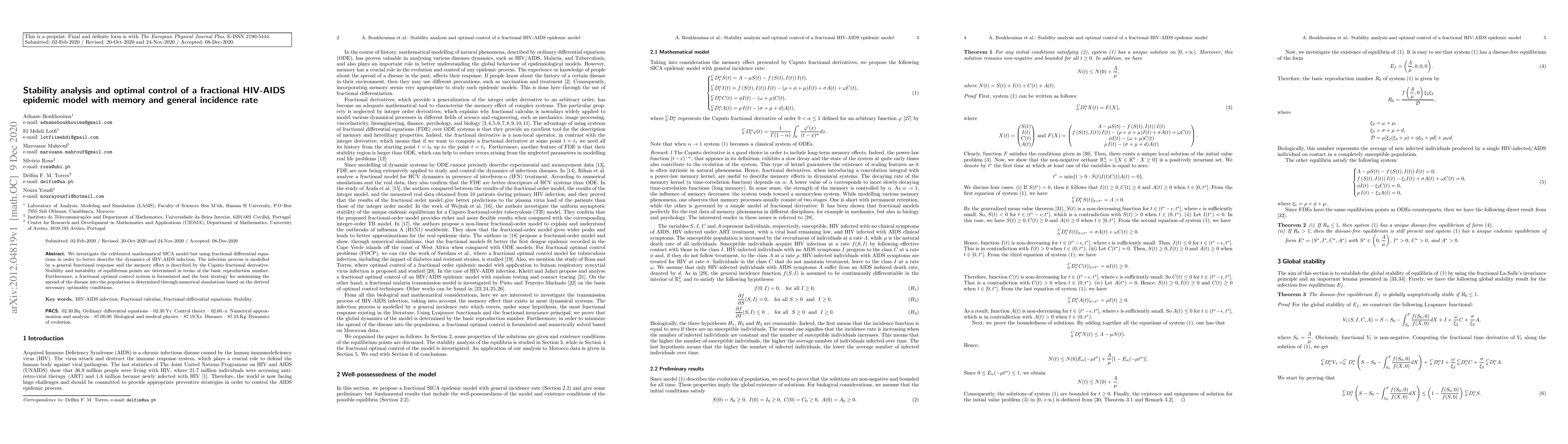 This paper analyzes the stability and optimal control of a fractional differential equation model for HIV-AIDS, incorporating a general incidence rate and memory effects. It determines equilibrium stability based on the basic reproduction number and formulates an optimal control strategy to minimize disease spread, validated through numerical simulations.