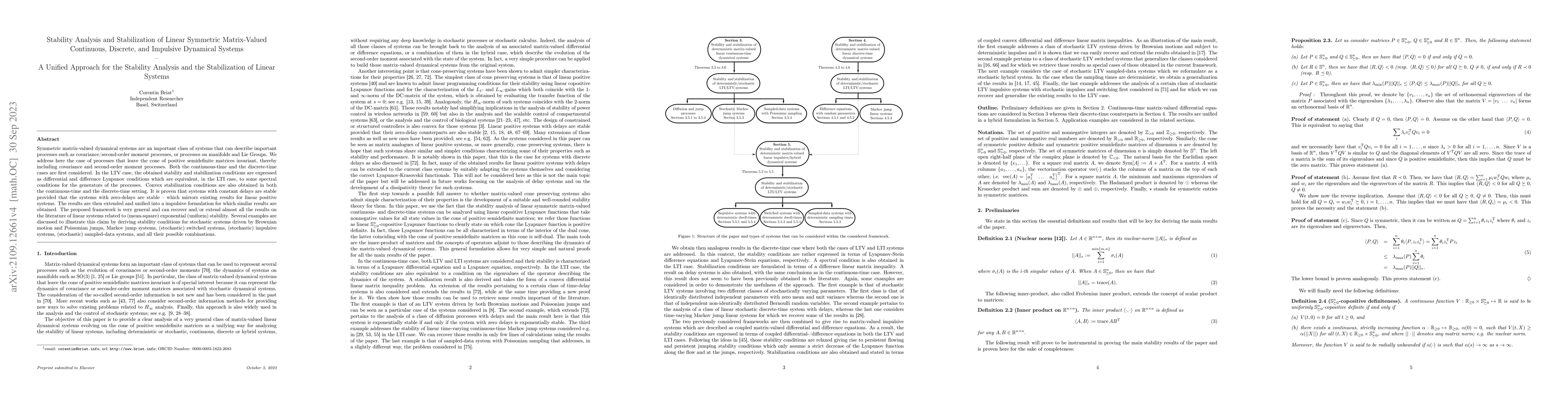 Symmetric matrix-valued dynamical systems are an important class of systems that can describe important processes such as covariance/second-order moment processes, or processes on manifolds and Lie Groups. We address here the case of processes that leave the cone of positive semidefinite matrices invariant, thereby including covariance and second-order moment processes. Both the continuous-time and the discrete-time cases are first considered. In the LTV case, the obtained stability and stabilization conditions are expressed as differential and difference Lyapunov conditions which are equivalent, in the LTI case, to some spectral conditions for the generators of the processes. Convex stabilization conditions are also obtained in both the continuous-time and the discrete-time setting. It is proven that systems with constant delays are stable provided that the systems with zero-delays are stable -- which mirrors existing results for linear positive systems. The results are then extended and unified into a impulsive formulation for which similar results are obtained. The proposed framework is very general and can recover and/or extend almost all the results on the literature of linear systems related to (mean-square) exponential (uniform) stability. Several examples are discussed to illustrate this claim by deriving stability conditions for stochastic systems driven by Brownian motion and Poissonian jumps, Markov jump systems, (stochastic) switched systems, (stochastic) impulsive systems, (stochastic) sampled-data systems, and all their possible combinations.