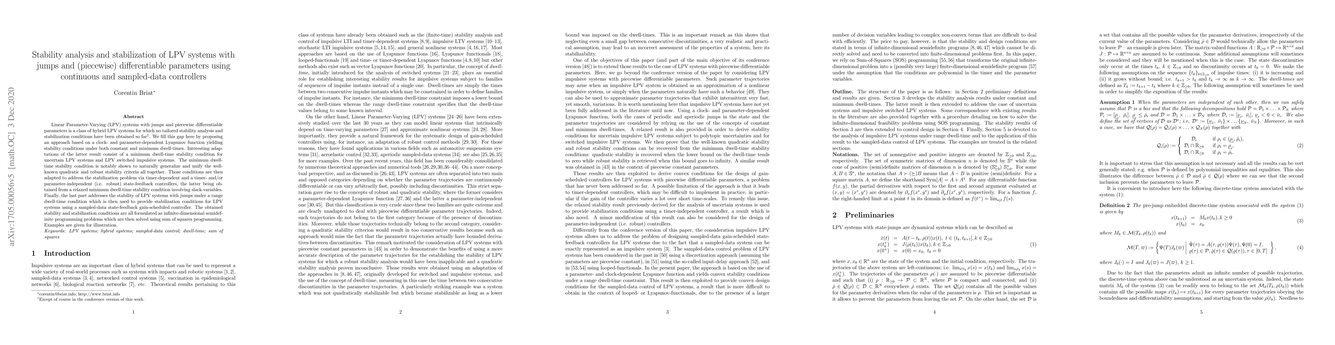 The paper proposes a stability analysis and stabilization approach for LPV systems with jumps and piecewise differentiable parameters using continuous and sampled-data controllers, formulated as infinite-dimensional semidefinite programming problems solved via sum of squares programming.