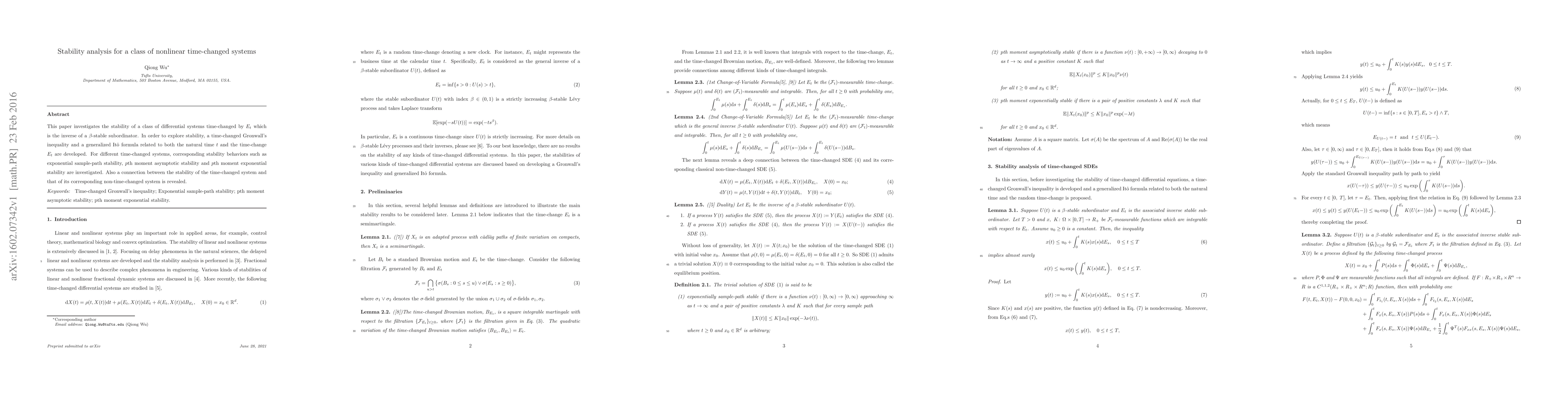 This paper develops stability criteria for nonlinear time-changed systems using a time-changed Gronwall's inequality and a generalized Itô formula. It examines various stability behaviors and reveals connections between the time-changed and non-time-changed systems' stability.