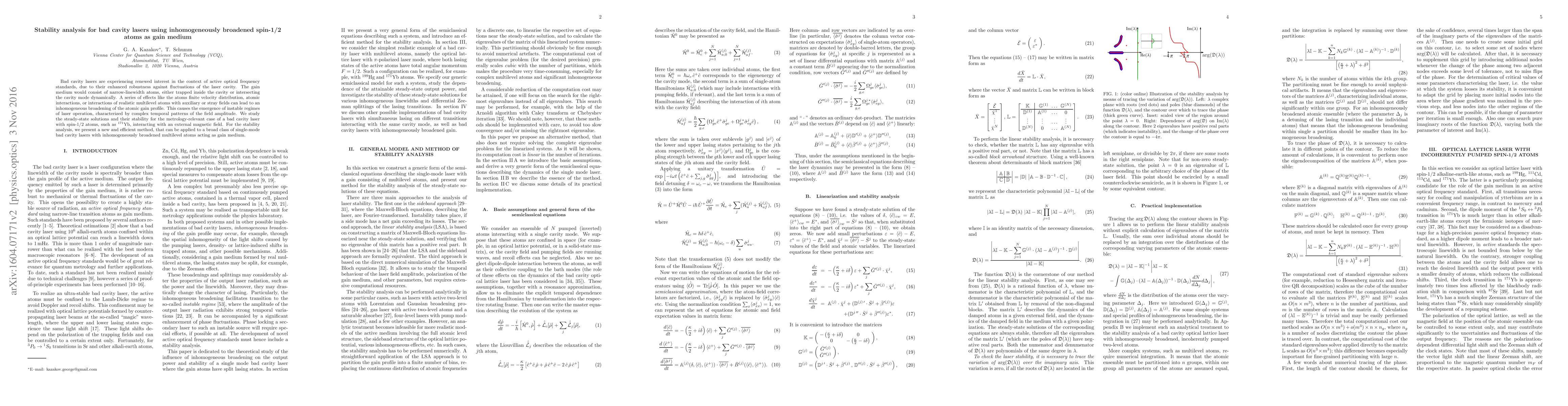 This paper investigates the stability of bad cavity lasers using inhomogeneously broadened spin-1/2 atoms, like Yb-171, as gain medium, focusing on the effects of atomic interactions and external magnetic fields. It introduces a new method for stability analysis applicable to a wide range of single-mode bad cavity lasers.