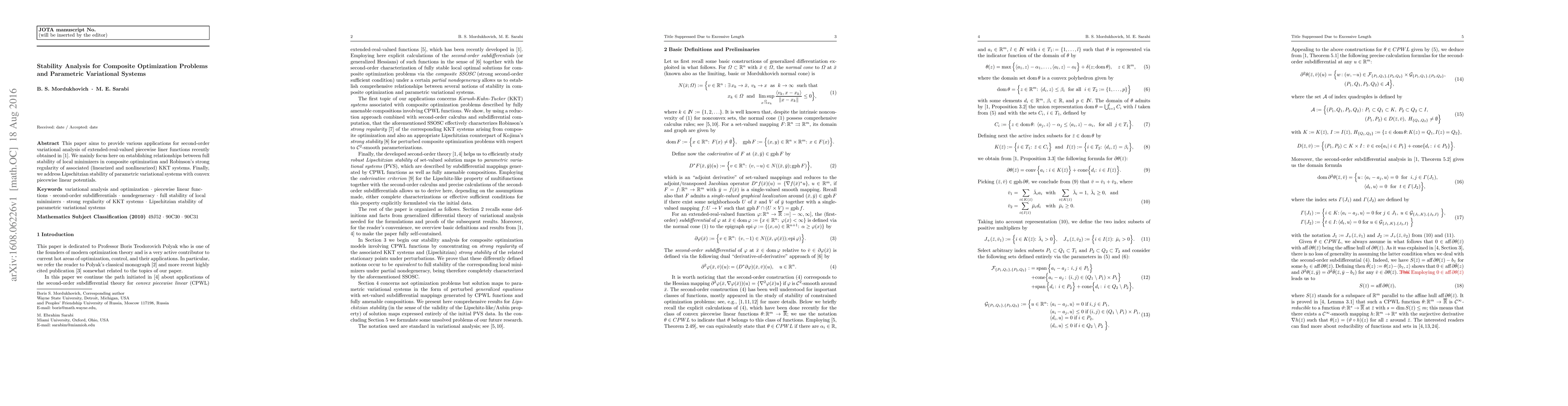 This paper explores the stability analysis of composite optimization problems using second-order variational analysis, establishing connections between stability of local minimizers and Robinson's strong regularity of KKT systems, and examines Lipschitzian stability in parametric variational systems with convex piecewise linear potentials.