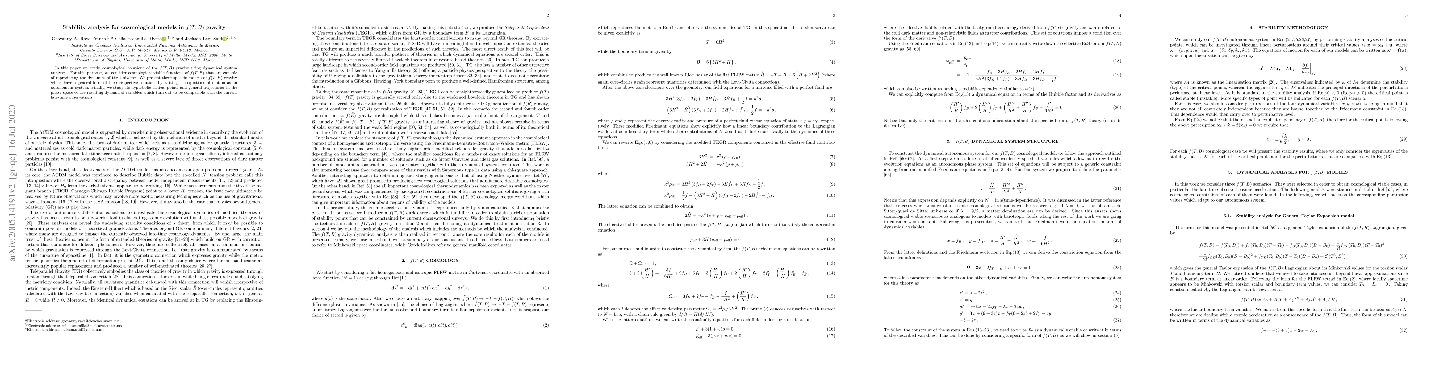 This paper investigates cosmological models in $f(T,B)$ gravity through dynamical system analysis, presenting three specific models that reproduce the universe's dynamics. It examines the stability of hyperbolic critical points and trajectories in the phase space, ensuring compatibility with current late-time observations.