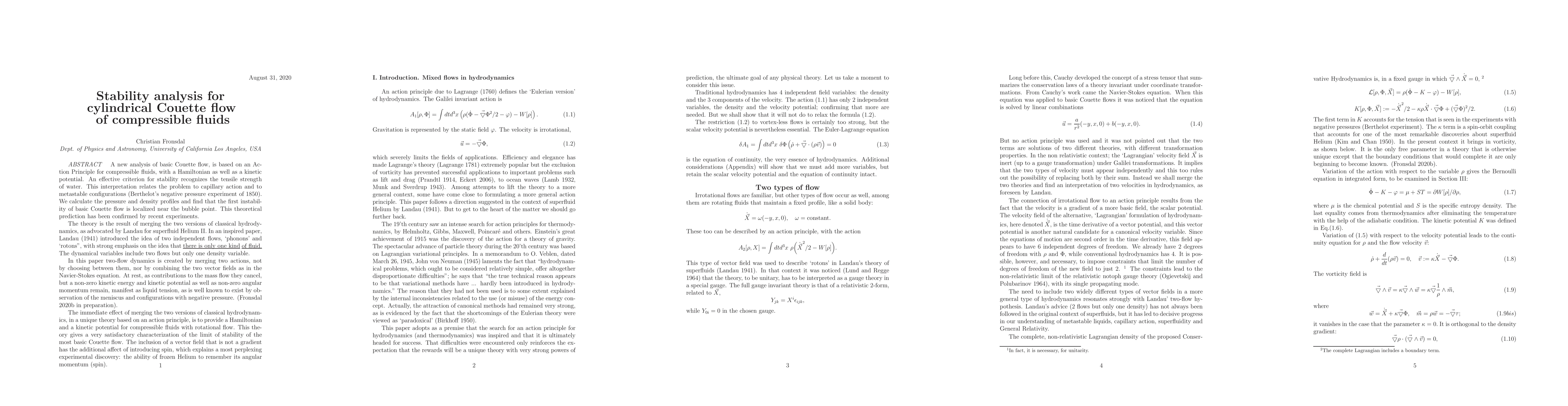 A new analysis of basic Couette flow, is based on an Action Principle for compressible fluids, with a Hamiltonian as well as a kinetic potential. An effective criterion for stability recognizes the tensile strength of water. This interpretation relates the problem to capillary action and to metastable configurations (Berthelot's negative pressure experiment of 1850). We calculate the pressure and density profiles and find that the first instability of basic Couette flow is localized near the bubble point. This theoretical prediction has been confirmed by recent experiments. The theory is the result of merging the two versions of classical hydrodynamics, as advocated by Landau for superfluid Helium II, but here applied to fluids in general, in accord with a widely held opinion concerning superfluidity. In this paper two-flow dynamics is created by merging two actions, not by choosing between them, nor by combining the two vector fields as in the Navier-Stokes equation . At rest, as contributions to the mass flow they cancel, but a non-zero kinetic energy and kinetic potential as well as non-zero angular momentum remain, manifest as liquid tension, as is well known to exist by observation of the meniscus and configurations with negative pressure. (Fronsdal 2020b in preparation). This theory gives a very satisfactory characterization of the limit of stability of the most basic Couette flow. The inclusion of a vector field that is not a gradient has the additional affect of introducing spin, which explains a most perplexing experimental discovery: the ability of frozen Helium to remember its angular momentum.