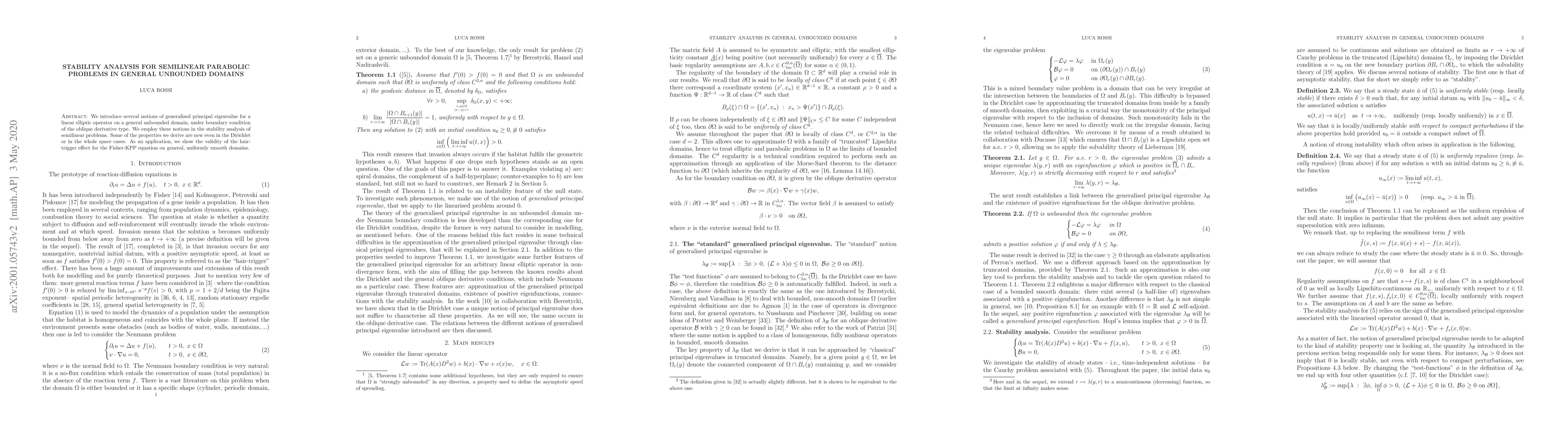 This paper introduces generalised principal eigenvalues for linear elliptic operators in unbounded domains, using them to analyze the stability of semilinear parabolic problems. It demonstrates the hair-trigger effect for the Fisher-KPP equation in uniformly smooth domains, with some findings novel even in bounded cases.