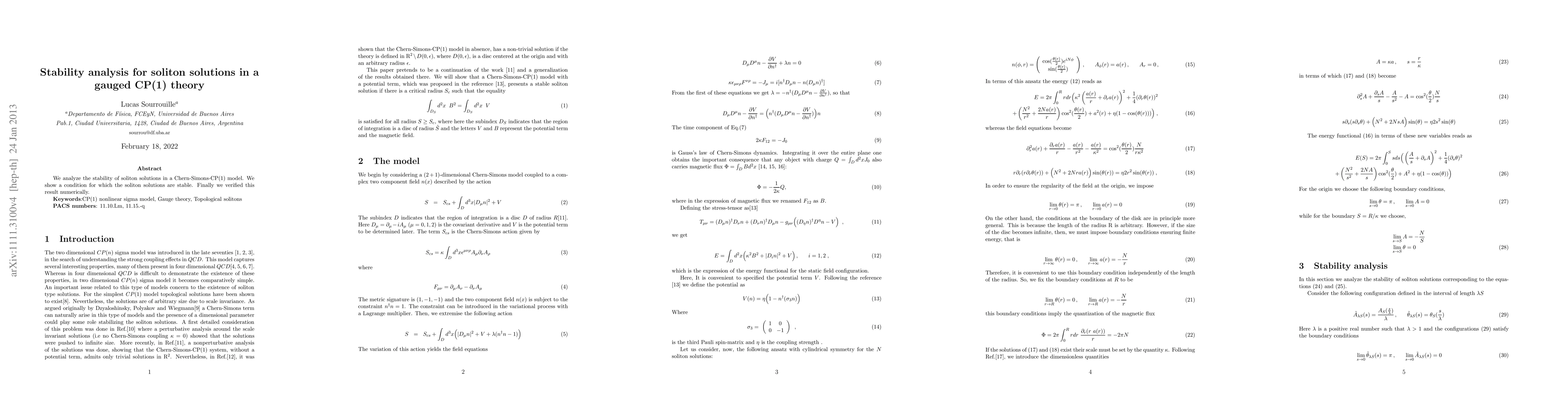 This paper investigates the stability of soliton solutions in a Chern-Simons-CP(1) model, establishing a specific condition for their stability, and confirms this theoretically derived result through numerical verification.