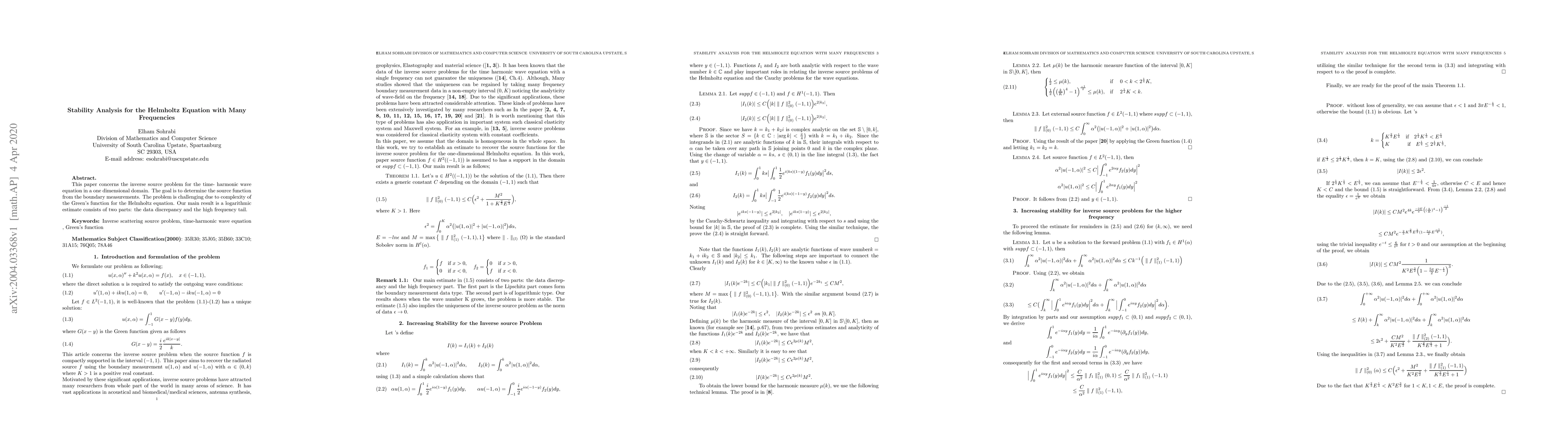 Researchers develop a logarithmic estimate to analyze stability for solving the Helmholtz equation with multiple frequencies, providing insights into inverse source problems in one-dimensional domains.