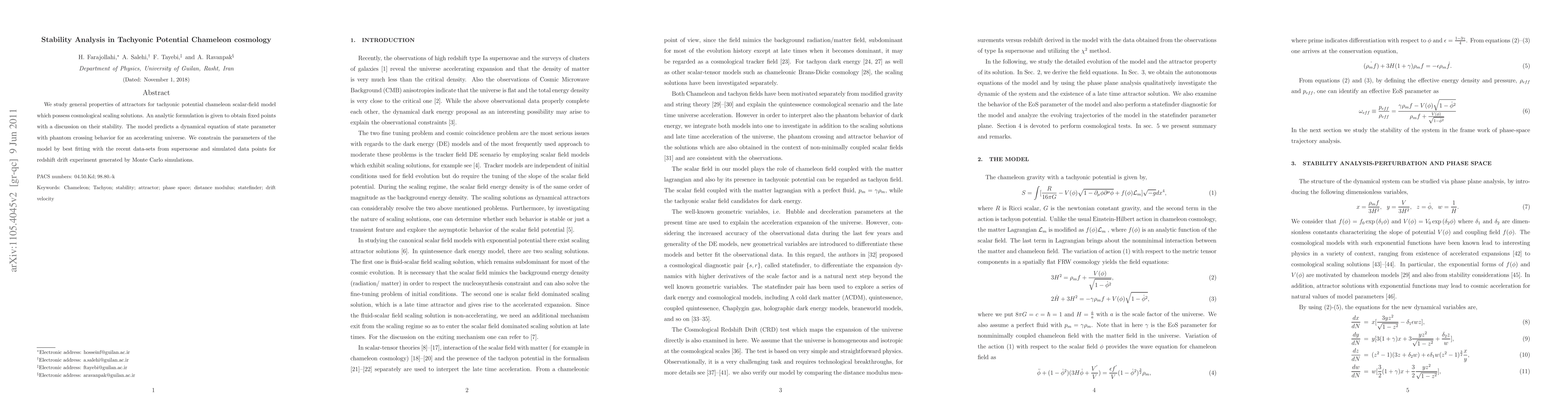 This study analyzes the stability of attractors in a tachyonic potential chameleon cosmology model, which predicts a dynamic equation of state parameter with phantom crossing behavior for an accelerating universe. The researchers constrain the model's parameters by comparing it to recent supernovae and simulated data.