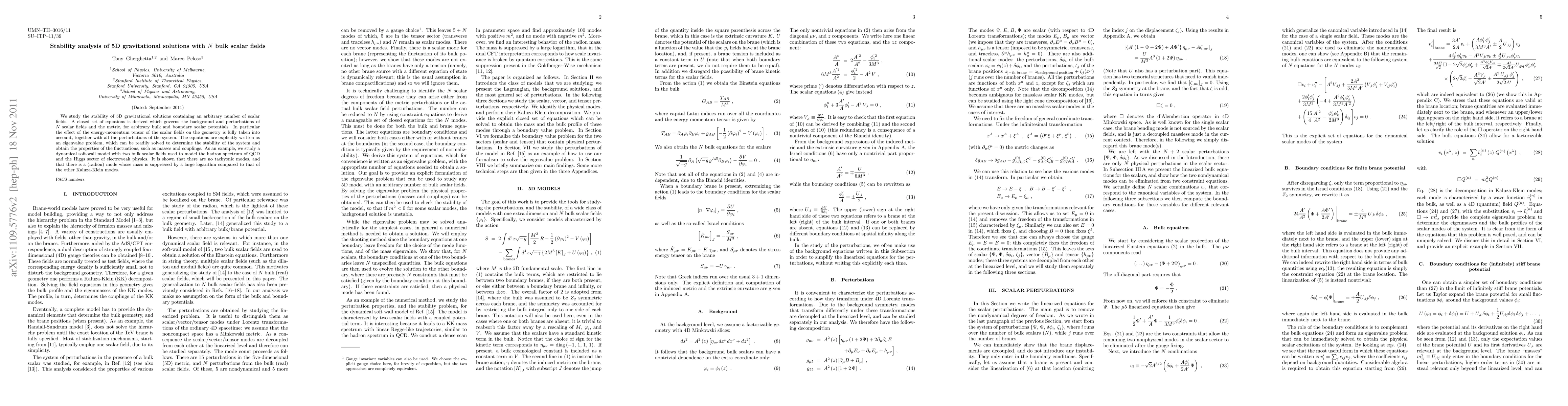 We study the stability of 5D gravitational solutions containing an arbitrary number of scalar fields. A closed set of equations is derived which governs the background and perturbations of N scalar fields and the metric, for arbitrary bulk and boundary scalar potentials. In particular the effect of the energy-momentum tensor of the scalar fields on the geometry is fully taken into account, together with all the perturbations of the system. The equations are explicitly written as an eigenvalue problem, which can be readily solved to determine the stability of the system and obtain the properties of the fluctuations, such as masses and couplings. As an example, we study a dynamical soft-wall model with two bulk scalar fields used to model the hadron spectrum of QCD and the Higgs sector of electroweak physics. It is shown that there are no tachyonic modes, and that there is a (radion) mode whose mass is suppressed by a large logarithm compared to that of the other Kaluza-Klein modes.