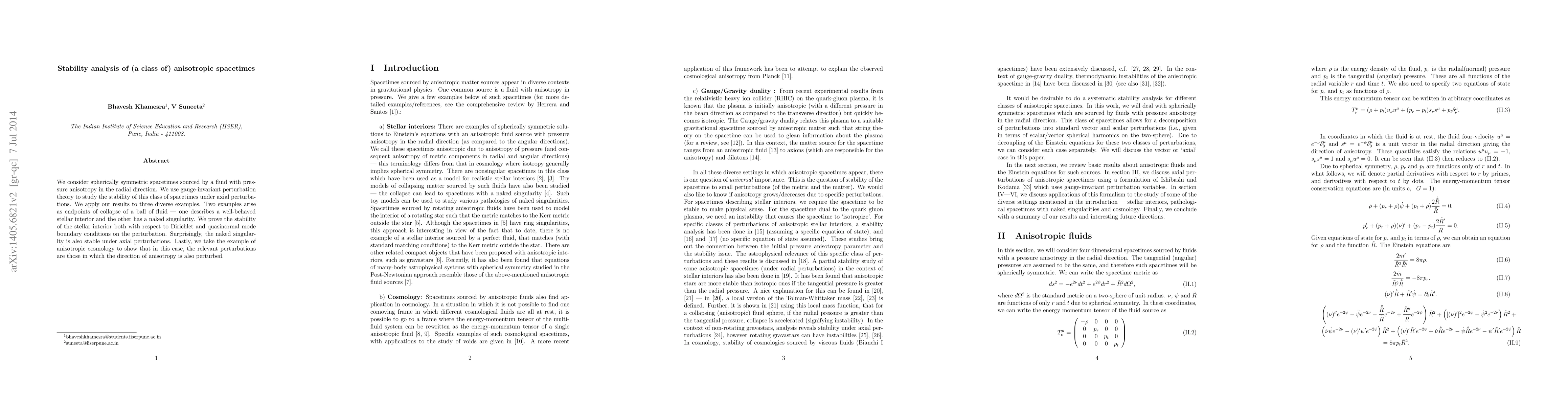We consider spherically symmetric spacetimes sourced by a fluid with pressure anisotropy in the radial direction. We use gauge-invariant perturbation theory to study the stability of this class of spacetimes under axial perturbations. We apply our results to three diverse examples. Two examples arise as endpoints of collapse of a ball of fluid --- one describes a well-behaved stellar interior and the other has a naked singularity. We prove the stability of the stellar interior both with respect to Dirichlet and quasinormal mode boundary conditions on the perturbation. Surprisingly, the naked singularity is also stable under axial perturbations. Lastly, we take the example of anisotropic cosmology to show that in this case, the relevant perturbations are those in which the direction of anisotropy is also perturbed.
