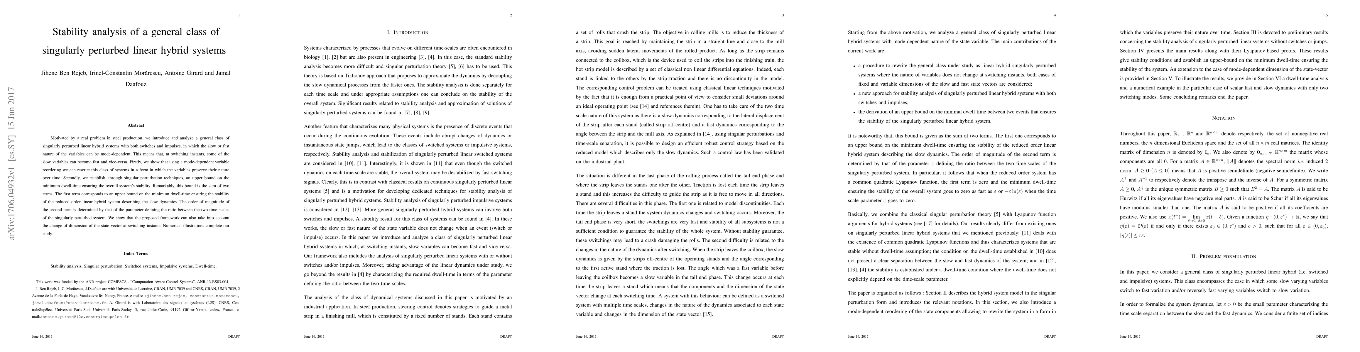 Motivated by a real problem in steel production, we introduce and analyze a general class of singularly perturbed linear hybrid systems with both switches and impulses, in which the slow or fast nature of the variables can be mode-dependent. This means that, at switching instants, some of the slow variables can become fast and vice-versa. Firstly, we show that using a mode-dependent variable reordering we can rewrite this class of systems in a form in which the variables preserve their nature over time. Secondly, we establish, through singular perturbation techniques, an upper bound on the minimum dwell-time ensuring the overall system's stability. Remarkably, this bound is the sum of two terms. The first term corresponds to an upper bound on the minimum dwell-time ensuring the stability of the reduced order linear hybrid system describing the slow dynamics. The order of magnitude of the second term is determined by that of the parameter defining the ratio between the two time-scales of the singularly perturbed system. We show that the proposed framework can also take into account the change of dimension of the state vector at switching instants. Numerical illustrations complete our study.