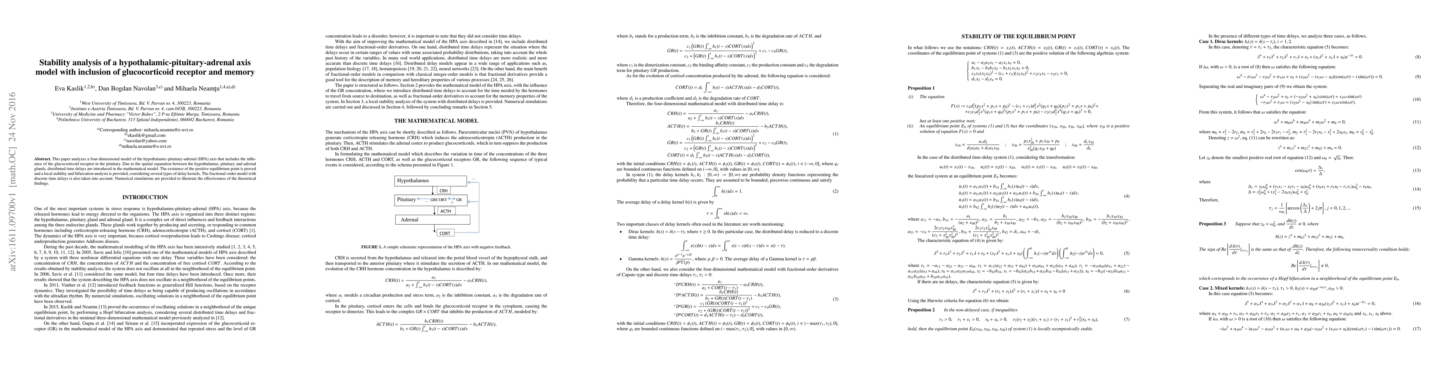 This paper analyzes a four-dimensional model of the hypothalamic-pituitary-adrenal (HPA) axis that includes the influence of the glucocorticoid receptor in the pituitary. Due to the spatial separation between the hypothalamus, pituitary and adrenal glands, distributed time delays are introduced in the mathematical model. The existence of the positive equilibrium point is proved and a local stability and bifurcation analysis is provided, considering several types of delay kernels. The fractional-order model with discrete time delays is also taken into account. Numerical simulations are provided to illustrate the effectiveness of the theoretical findings.