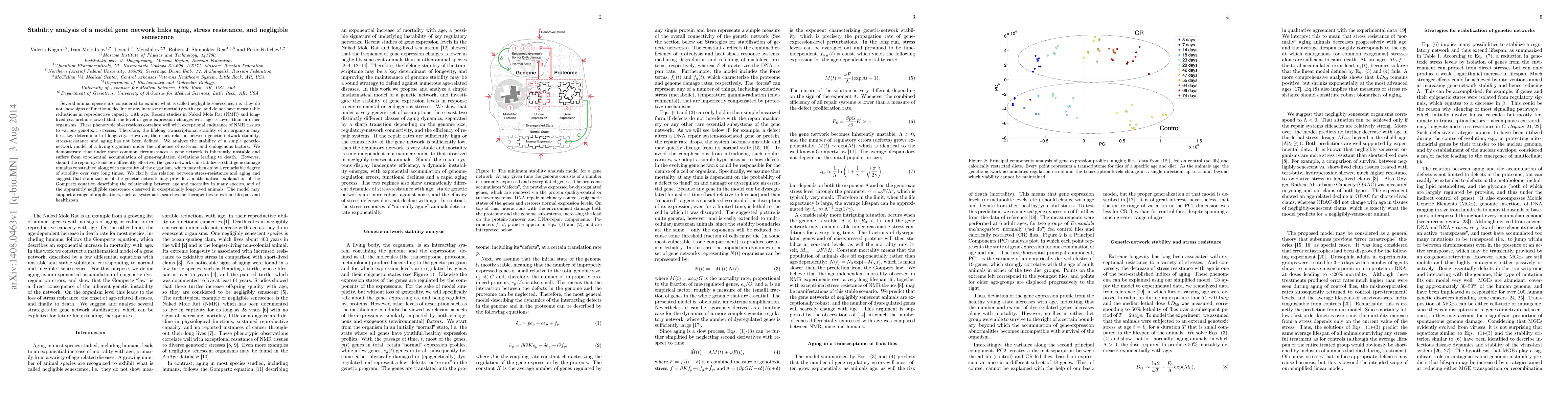 Several animal species are considered to exhibit what is called negligible senescence, i.e. they do not show signs of functional decline or any increase of mortality with age, and do not have measurable reductions in reproductive capacity with age. Recent studies in Naked Mole Rat (NMR) and long- lived sea urchin showed that the level of gene expression changes with age is lower than in other organisms. These phenotypic observations correlate well with exceptional endurance of NMR tissues to various genotoxic stresses. Therefore, the lifelong transcriptional stability of an organism may be a key determinant of longevity. However, the exact relation between genetic network stability, stress-resistance and aging has not been defined. We analyze the stability of a simple genetic- network model of a living organism under the influence of external and endogenous factors. We demonstrate that under most common circumstances a gene network is inherently unstable and suffers from exponential accumulation of gene-regulation deviations leading to death. However, should the repair systems be sufficiently effective, the gene network can stabilize so that gene damage remains constrained along with mortality of the organism, which may then enjoy a remarkable degree of stability over very long times. We clarify the relation between stress-resistance and aging and suggest that stabilization of the genetic network may provide a mathematical explanation of the Gompertz equation describing the relationship between age and mortality in many species, and of the apparently negligible senescence observed in exceptionally long-lived animals. The model may support a range of applications, such as systematic searches for therapeutics to extend lifespan and healthspan.