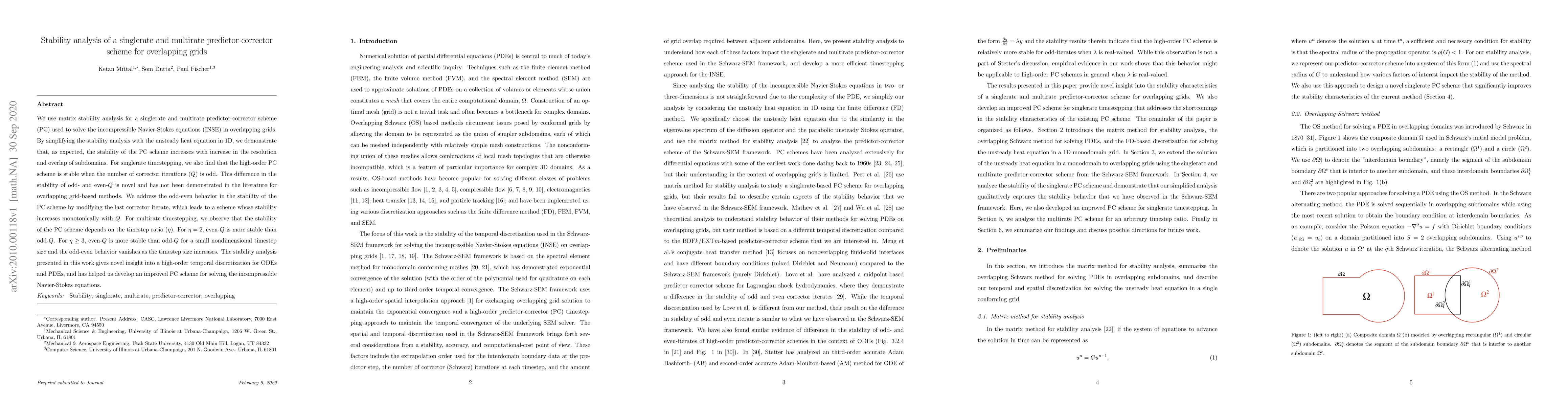 We use matrix stability analysis for a singlerate and multirate predictor-corrector scheme (PC) used to solve the incompressible Navier-Stokes equations (INSE) in overlapping grids. By simplifying the stability analysis with the unsteady heat equation in 1D, we demonstrate that, as expected, the stability of the PC scheme increases with increase in the resolution and overlap of subdomains. For singlerate timestepping, we also find that the high-order PC scheme is stable when the number of corrector iterations ($Q$) is odd. This difference in the stability of odd- and even-$Q$ is novel and has not been demonstrated in the literature for overlapping grid-based methods. We address the odd-even behavior in the stability of the PC scheme by modifying the last corrector iterate, which leads to a scheme whose stability increases monotonically with $Q$. For multirate timestepping, we observe that the stability of the PC scheme depends on the timestep ratio ($\eta$). For $\eta=2$, even-$Q$ is more stable than odd-$Q$. For $\eta\ge3$, even-$Q$ is more stable than odd-$Q$ for a small nondimensional timestep size and the odd-even behavior vanishes as the timestep size increases. The stability analysis presented in this work gives novel insight into a high-order temporal discretization for ODEs and PDEs, and has helped us develop an improved PC scheme for solving the incompressible Navier-Stokes equations.