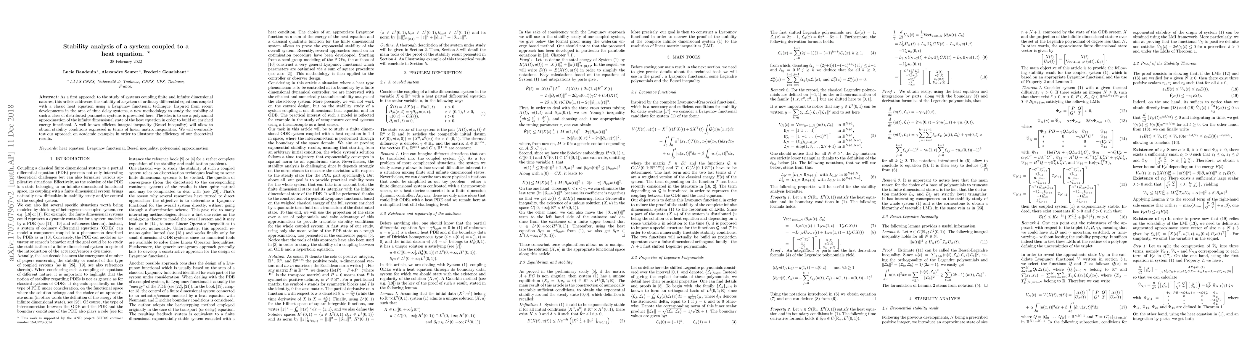 This paper presents a novel methodology for stability analysis of systems coupled to a heat equation using a Lyapunov functional approach. It employs a polynomial approximation of the heat equation to build an enriched energy functional, leading to stability conditions expressed as linear matrix inequalities.