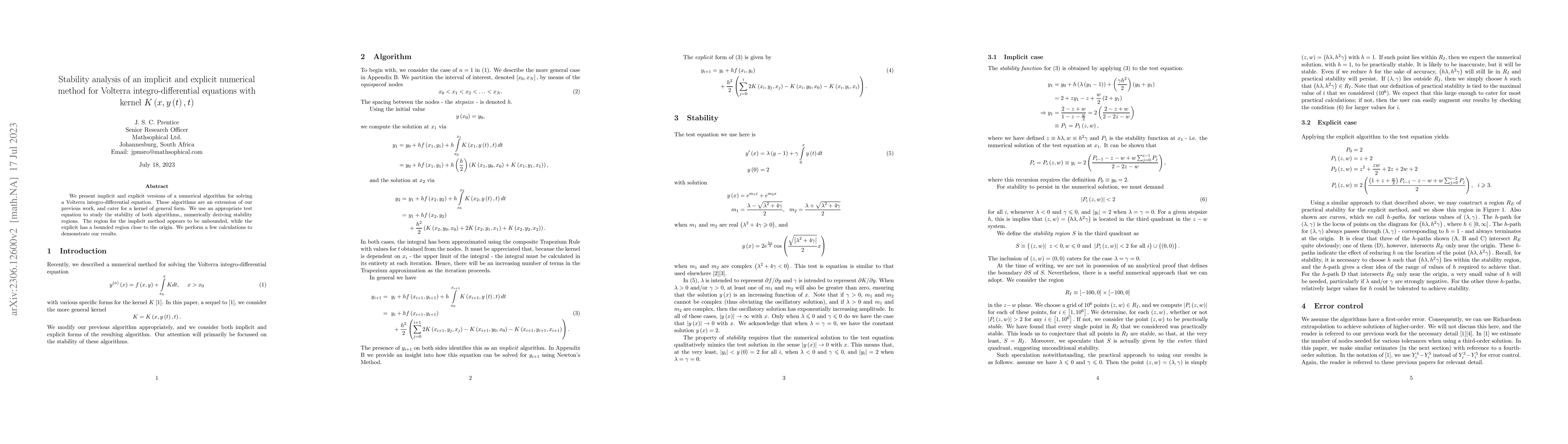 This paper extends previous work by presenting implicit and explicit numerical methods for solving Volterra integro-differential equations with general kernel forms. Stability analysis reveals that the implicit method has an unbounded stability region, while the explicit method has a bounded region near the origin.