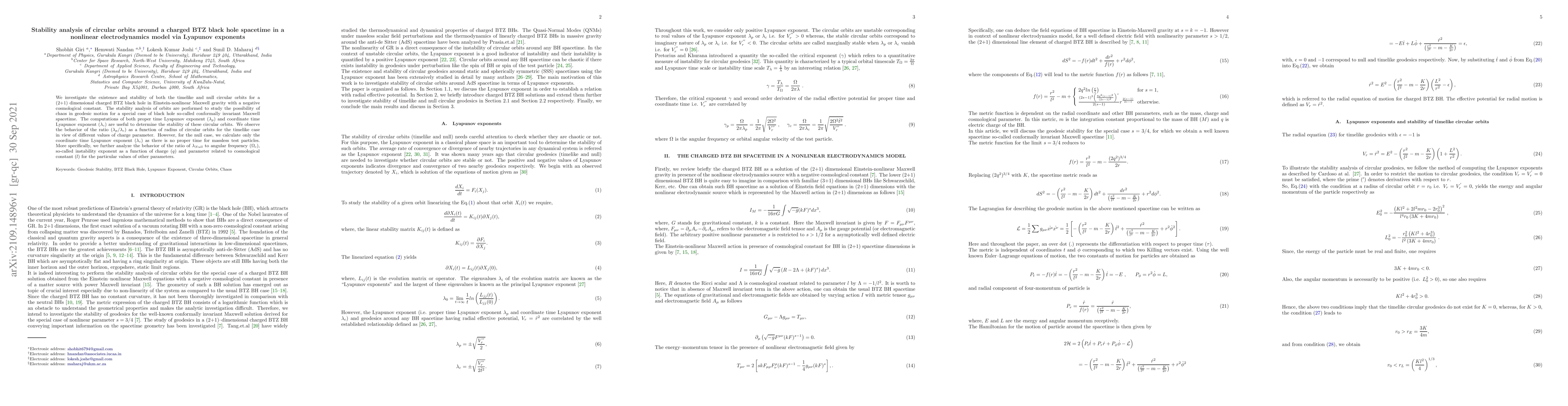 We investigate the existence and stability of both the timelike and null circular orbits for a (2+1) dimensional charged BTZ black hole in Einstein-nonlinear Maxwell gravity with a negative cosmological constant. The stability analysis of orbits are performed to study the possibility of chaos in geodesic motion for a special case of black hole so-called conformally invariant Maxwell spacetime. The computations of both proper time Lyapunov exponent ($\lambda_{p}$) and coordinate time Lyapunov exponent ($\lambda_{c}$) are useful to determine the stability of these circular orbits. We observe the behavior of the ratio $(\lambda_{p}/\lambda_{c})$ as a function of radius of circular orbits for the timelike case in view of different values of charge parameter. However, for the null case, we calculate only the coordinate time Lyapunov exponent ($\lambda_{c}$) as there is no proper time for massless test particles. More specifically, we further analyze the behavior of the ratio of $\lambda_{Null}$ to angular frequency ($\Omega_{c}$), so-called instability exponent as a function of charge ($q$) and parameter related to cosmological constant ($l$) for the particular values of other parameters.