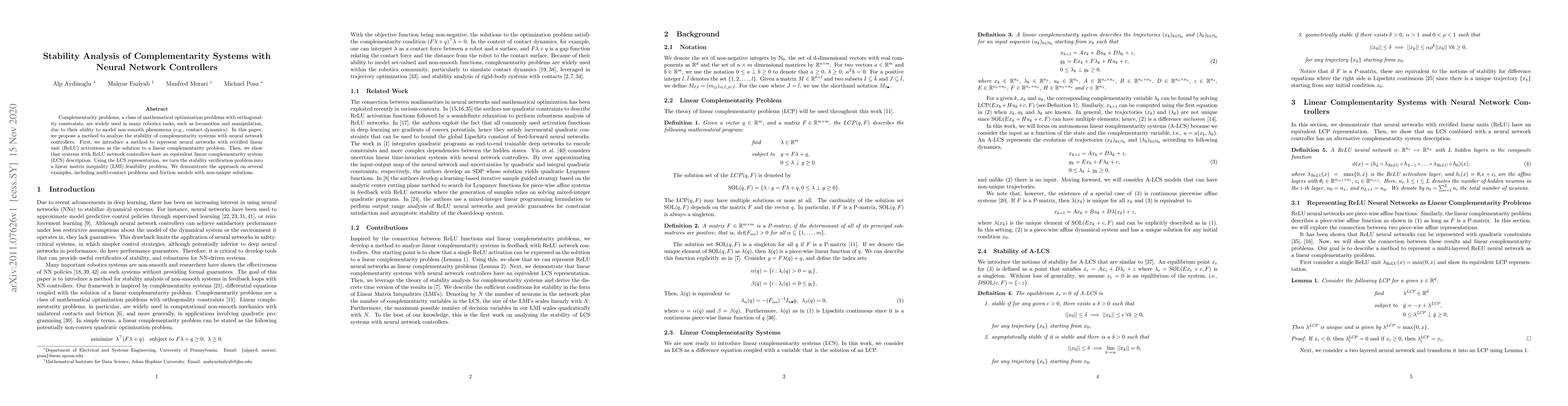 The paper proposes a method to analyze the stability of complementarity systems with neural network controllers by representing ReLU networks as solutions to linear complementarity problems and transforming the system into an equivalent linear complementarity system (LCS).