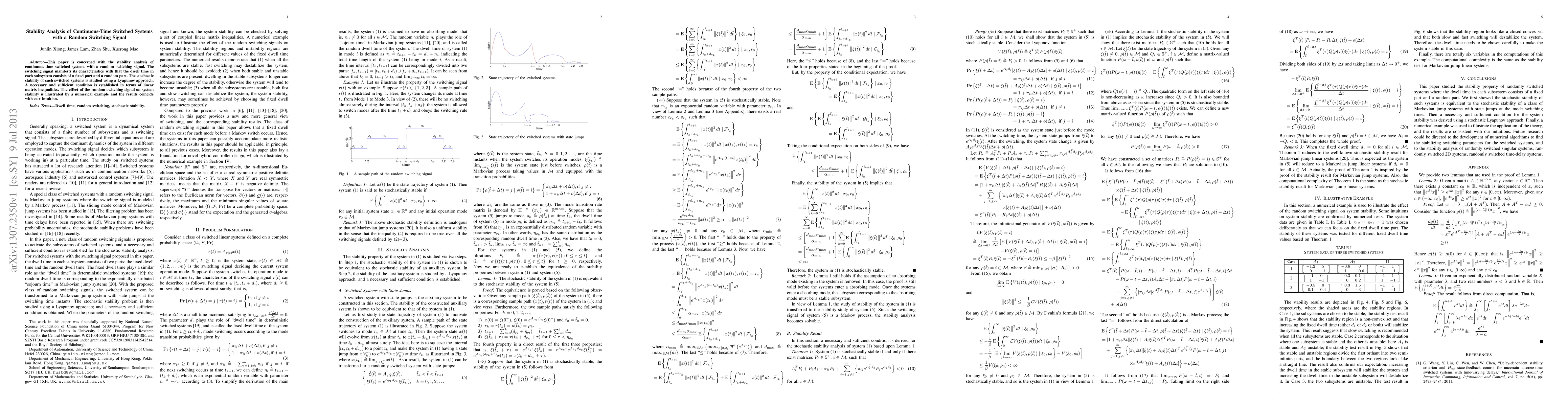 This paper analyzes the stability of continuous-time switched systems with random switching signals, establishing a Lyapunov-based condition for stochastic stability through linear matrix inequalities. A numerical example demonstrates the impact of random switching on system stability.