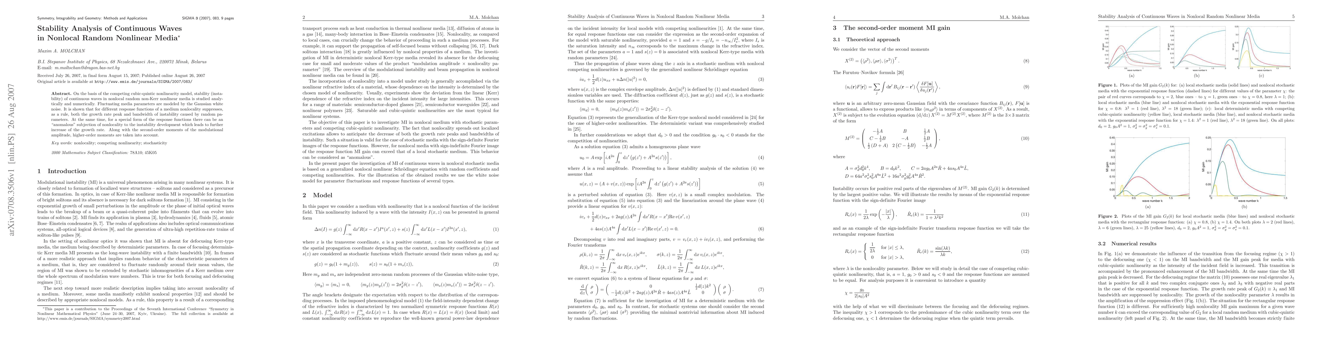 This paper analyzes the stability of continuous waves in nonlocal random nonlinear media using a competing cubic-quintic nonlinearity model. It finds that nonlocality generally suppresses instability growth rates and bandwidth, but under certain conditions, it can paradoxically enhance instability.