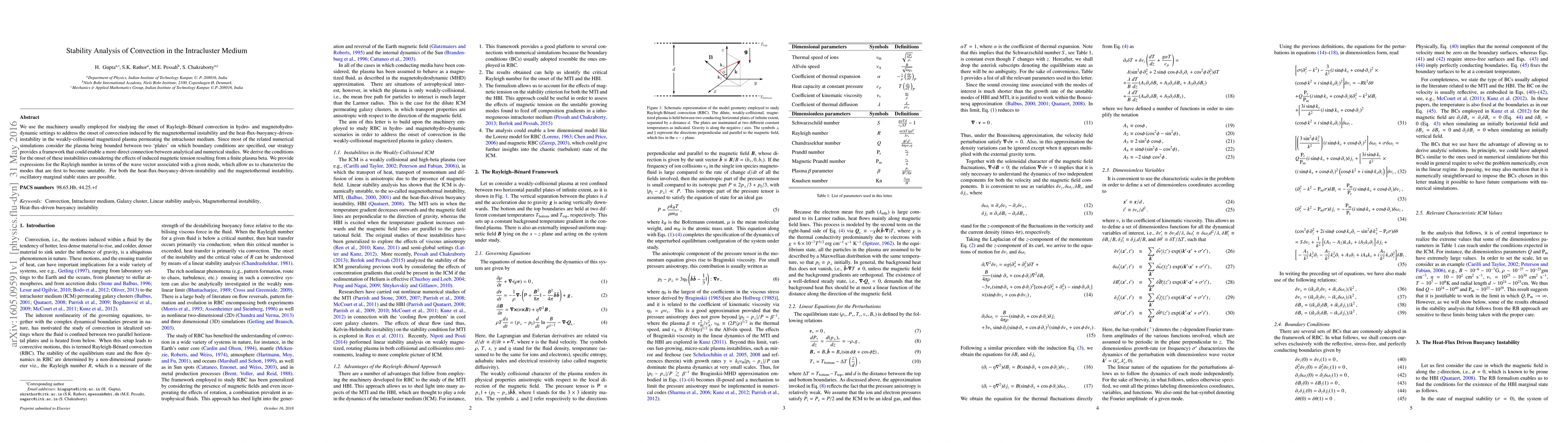 This paper analyzes the onset of convection in the intracluster medium using methods from Rayleigh-Bénard convection, focusing on magnetothermal and heat-flux-buoyancy instabilities in weakly-collisional magnetized plasma. It derives conditions for instability onset and provides expressions for the Rayleigh number, characterizing the first unstable modes and noting possible oscillatory marginal stable states.