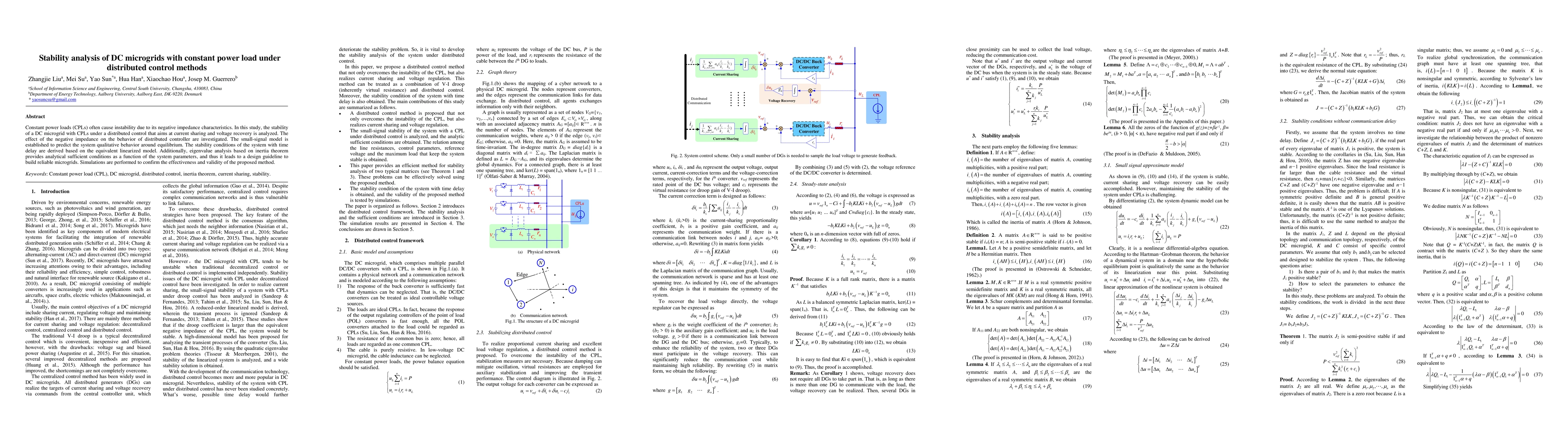 DC microgrids are becoming popular as effective means to integrate various renewable energy resources. Constant power loads (CPLs) may yield instability due to the negative impedance characteristic. This paper analyzes the stability of the DC microgrid in presence of CPL. Distributed generations (DGs) are controlled by using a distributed controller which aims at current sharing and voltage recovery. For simplicity, a reduced order model is derived on the fundamental of neglecting the transient state of the DC/DC converter. The purpose of this paper is to analyze stability conditions and give the suggestions to design control parameters. The stability conditions are obtained by using inertia theorem. Moreover, this paper makes a further detailed research based on the existed theorems. Simulation results are provided to verify the effectiveness and validity of the proposed theorem.