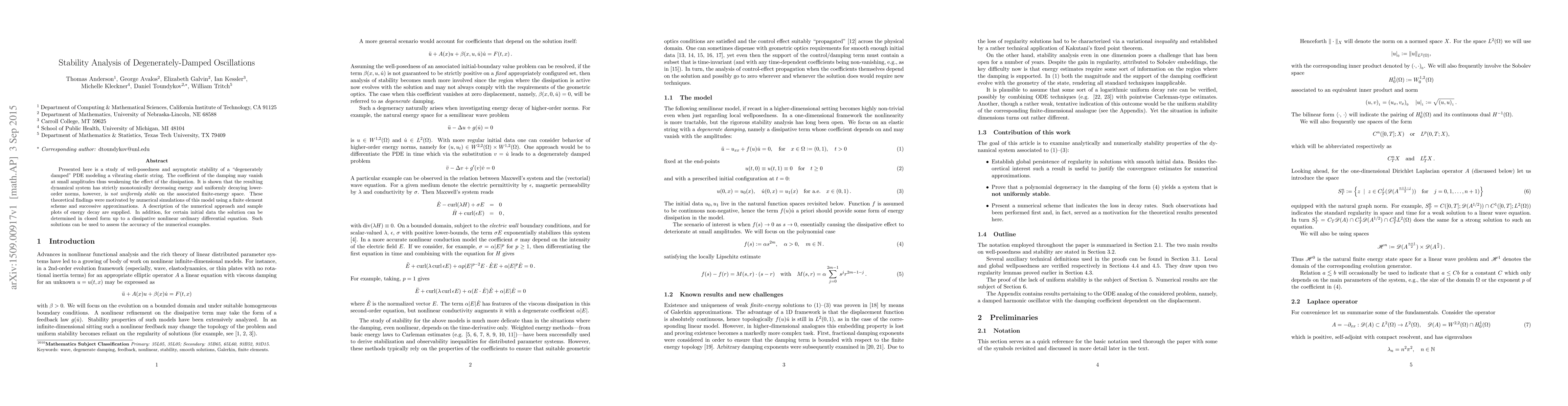 Presented here is a study of well-posedness and asymptotic stability of a "degenerately damped" PDE modeling a vibrating elastic string. The coefficient of the damping may vanish at small amplitudes thus weakening the effect of the dissipation. It is shown that the resulting dynamical system has strictly monotonically decreasing energy and uniformly decaying lower-order norms, however, is not uniformly stable on the associated finite-energy space. These theoretical findings were motivated by numerical simulations of this model using a finite element scheme and successive approximations. A description of the numerical approach and sample plots of energy decay are supplied. In addition, for certain initial data the solution can be determined in closed form up to a dissipative nonlinear ordinary differential equation. Such solutions can be used to assess the accuracy of the numerical examples.