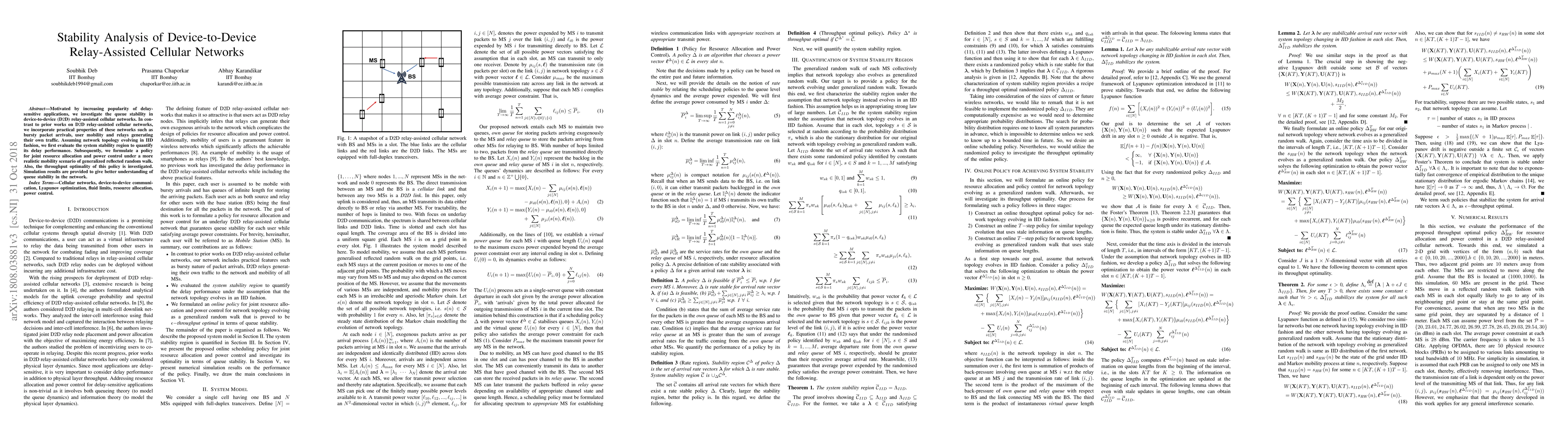 This paper investigates the stability of device-to-device relay-assisted cellular networks, considering bursty arrivals, user mobility, and relay traffic. It evaluates the stability region and proposes a joint resource allocation and power control policy under generalized reflected random walk mobility, while also examining its throughput optimality through simulations.