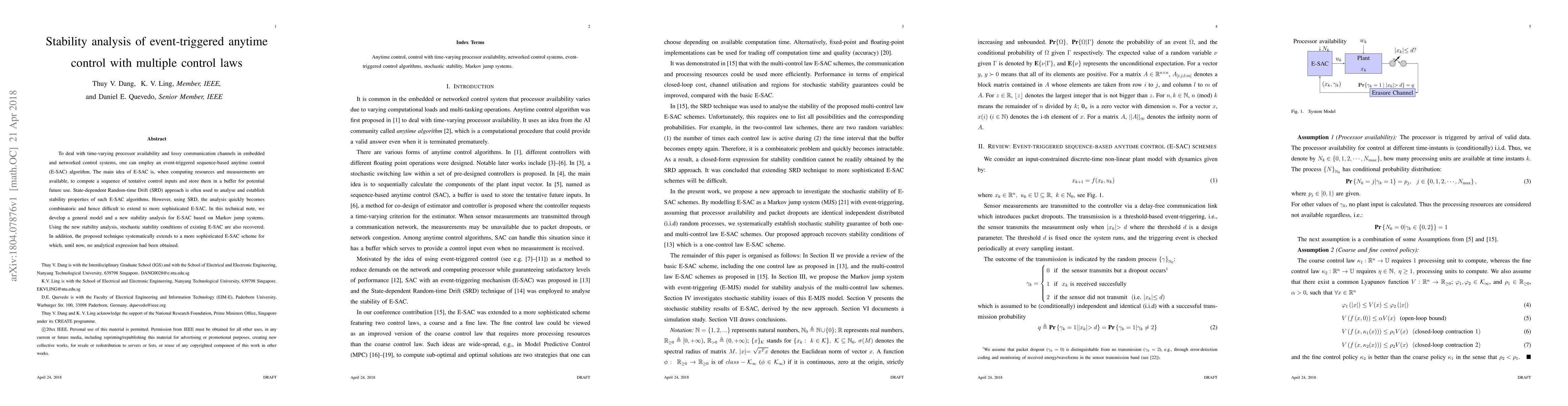 To deal with time-varying processor availability and lossy communication channels in embedded and networked control systems, one can employ an event-triggered sequence-based anytime control (E-SAC) algorithm. The main idea of E-SAC is, when computing resources and measurements are available, to compute a sequence of tentative control inputs and store them in a buffer for potential future use. State-dependent Random-time Drift (SRD) approach is often used to analyse and establish stability properties of such E-SAC algorithms. However, using SRD, the analysis quickly becomes combinatoric and hence difficult to extend to more sophisticated E-SAC. In this technical note, we develop a general model and a new stability analysis for E-SAC based on Markov jump systems. Using the new stability analysis, stochastic stability conditions of existing E-SAC are also recovered. In addition, the proposed technique systematically extends to a more sophisticated E-SAC scheme for which, until now, no analytical expression had been obtained.