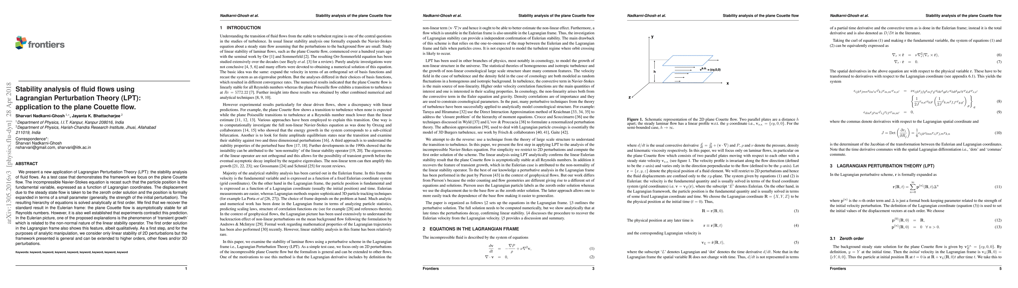 We present a new application of Lagrangian Perturbation Theory (LPT): the stability analysis of fluid flows. As a test case that demonstrates the framework we focus on the plane Couette flow. The incompressible Navier-Stokes equation is recast such that the particle position is the fundamental variable, expressed as a function of Lagrangian coordinates. The displacement due to the steady state flow is taken to be the zeroth order solution and the position is formally expanded in terms of a small parameter (generally, the strength of the initial perturbation). The resulting hierarchy of equations is solved analytically at first order. We find that we recover the standard result in the Eulerian frame: the plane Couette flow is asymptotically stable for all Reynolds numbers. However, it is also well established that experiments contradict this prediction. In the Eulerian picture, one of the proposed explanations is the phenomenon of `transient growth' which is related to the non-normal nature of the linear stability operator. The first order solution in the Lagrangian frame also shows this feature, albeit qualitatively. As a first step, and for the purposes of analytic manipulation, we consider only linear stability of 2D perturbations but the framework presented is general and can be extended to higher orders, other flows and/or 3D perturbations.