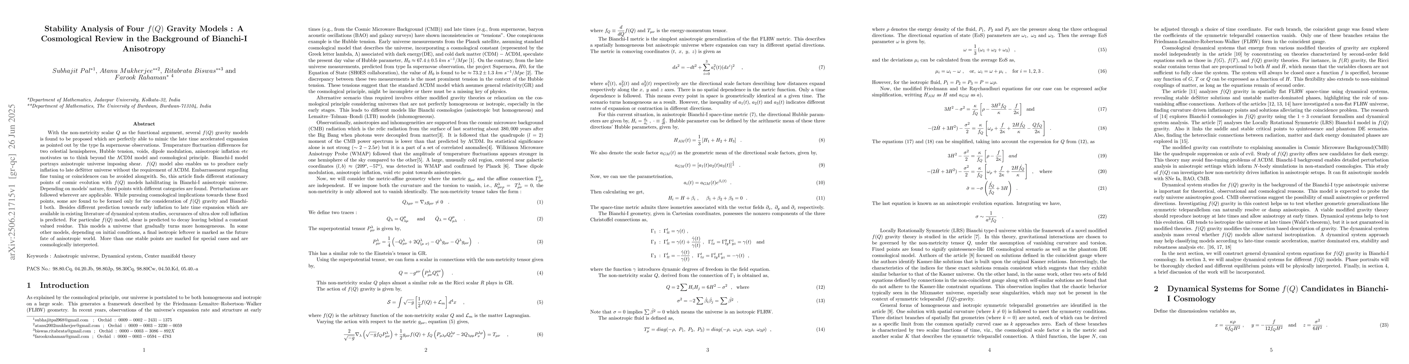 With the non-metricity scalar $Q$ as the functional argument, several $f(Q)$ gravity models is found to be proposed which are perfectly able to mimic the late time accelerated expansion as pointed out by the type Ia supernovae observations. Temperature fluctuation differences for two celestial hemispheres, Hubble tension, voids, dipole modulation, anisotropic inflation etc motivates us to think beyond the $\Lambda$CDM model and cosmological principle. Bianchi-I model portrays anisotropic universe imposing shear. $f(Q)$ model also enables us to produce early inflation to late deSitter universe without the requirement of $\Lambda$CDM. Embarrassment regarding fine tuning or coincidences can be avoided alongwith. So, this article finds different stationary points of cosmic evolution with $f(Q)$ models habilitating in Bianchi-I anisotropic universe. Depending on models' nature, fixed points with different categories are found. Perturbations are followed wherever are applicable. While pursuing cosmological implications towards these fixed points, some are found to be formed only for the consideration of $f(Q)$ gravity and Bianchi-I both. Besides different prediction towards early inflation to late time expansion which are available in existing literature of dynamical system studies, occurances of ultra slow roll inflation is predicted. For particular $f(Q)$ model, shear is predicted to decay leaving behind a constant valued residue. This models a universe that gradually turns more homogeneous. In some other models, depending on initial conditions, a final isotropic leftover is marked as the future fate of anisotropic world. More than one stable points are marked for special cases and are cosmologically interpreted.