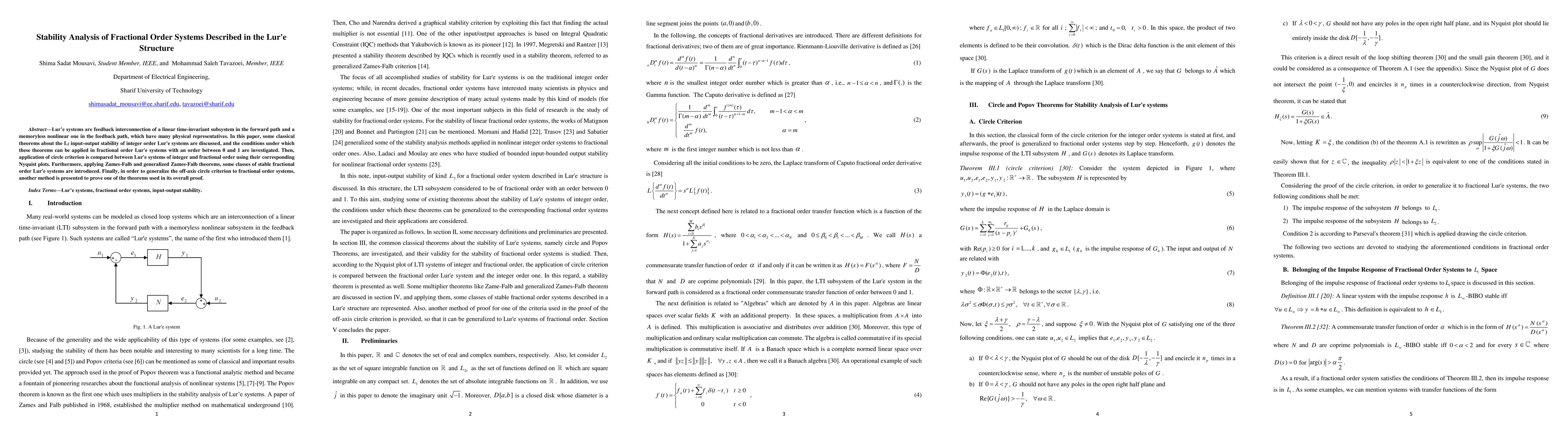This paper explores the stability analysis of fractional order Lur'e systems, extending classical theorems from integer order systems to fractional systems. It introduces new methods to apply the circle criterion and generalized Zames-Falb theorems for fractional order Lur'e systems, providing a comprehensive approach to their stability analysis.