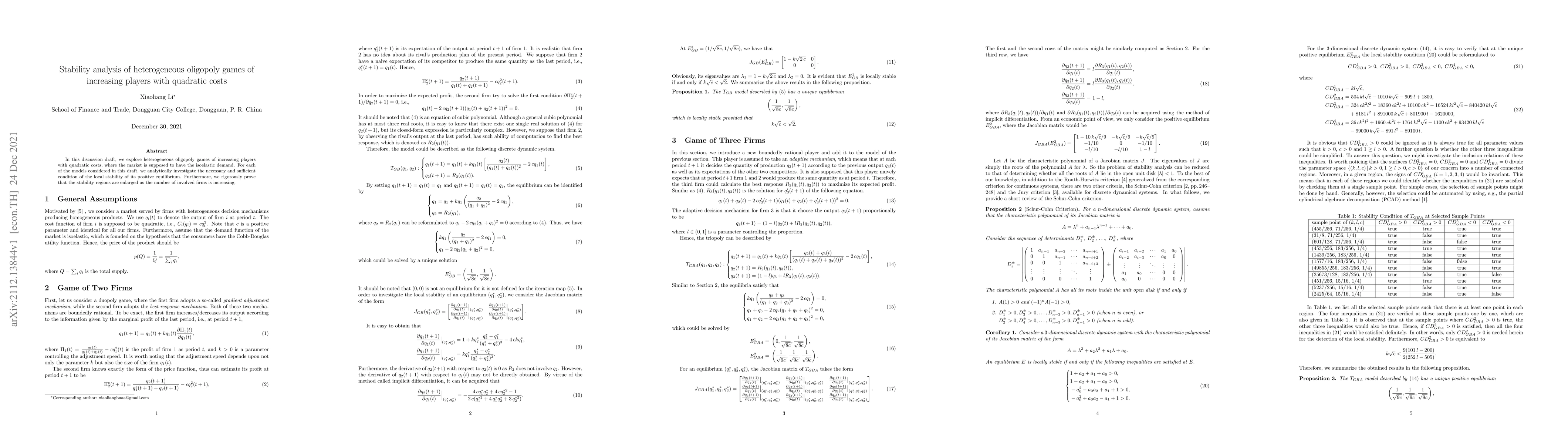 In this discussion draft, we explore heterogeneous oligopoly games of increasing players with quadratic costs, where the market is supposed to have the isoelastic demand. For each of the models considered in this draft, we analytically investigate the necessary and sufficient condition of the local stability of its positive equilibrium. Furthermore, we rigorously prove that the stability regions are enlarged as the number of involved firms is increasing.