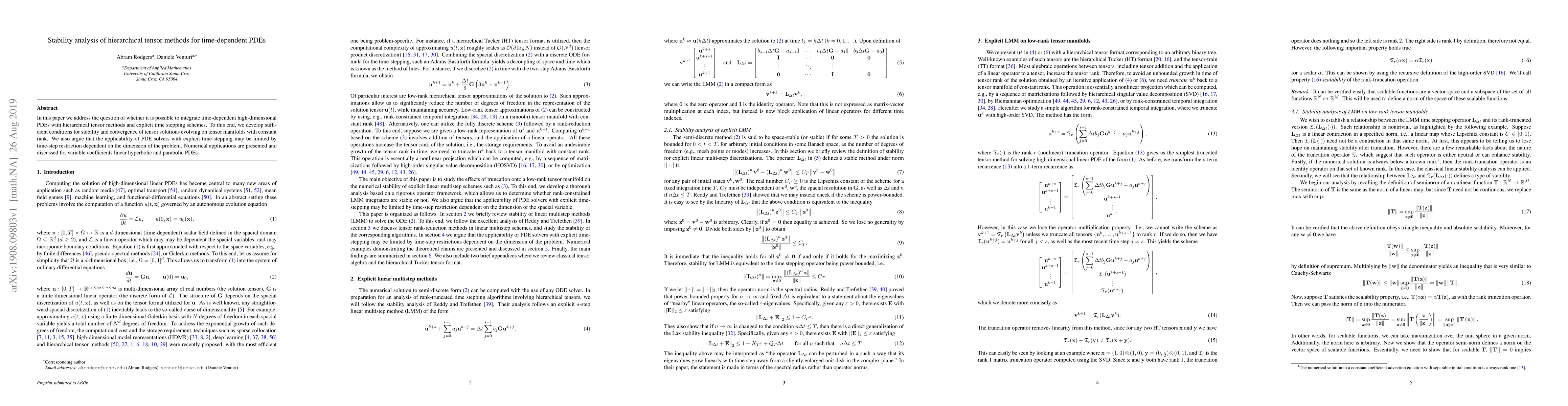 This paper develops stability and convergence conditions for hierarchical tensor methods applied to time-dependent high-dimensional PDEs using explicit time-stepping schemes. It highlights limitations in the applicability of such methods due to dimension-dependent time-step restrictions, supported by numerical examples for linear hyperbolic and parabolic PDEs.