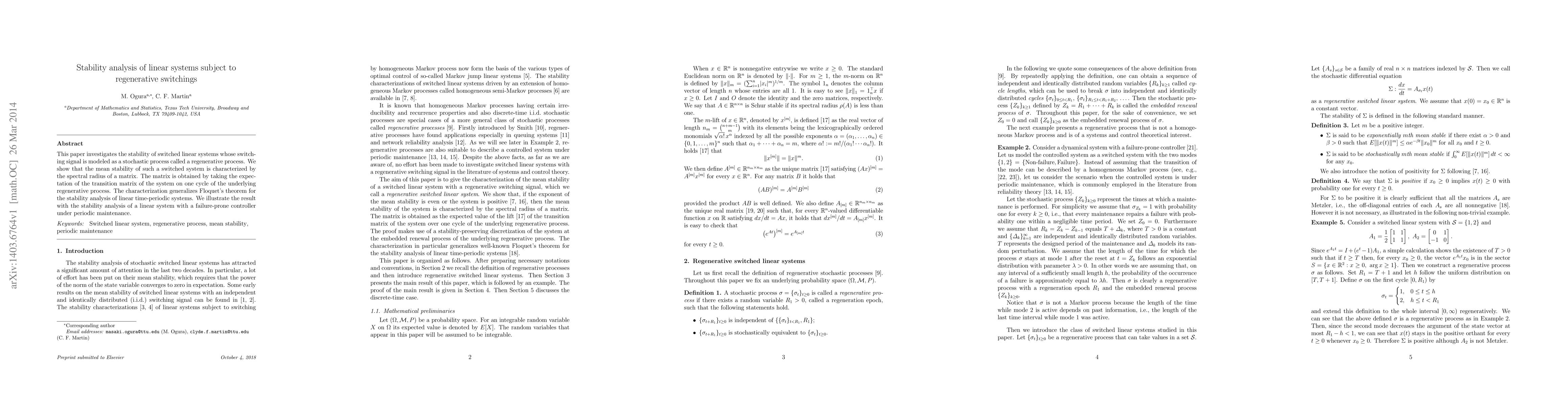 This paper characterizes the mean stability of switched linear systems with regenerative switchings by the spectral radius of an expected transition matrix, generalizing Floquet's theorem for linear time-periodic systems. An example is provided analyzing the stability of a failure-prone controller under periodic maintenance.
