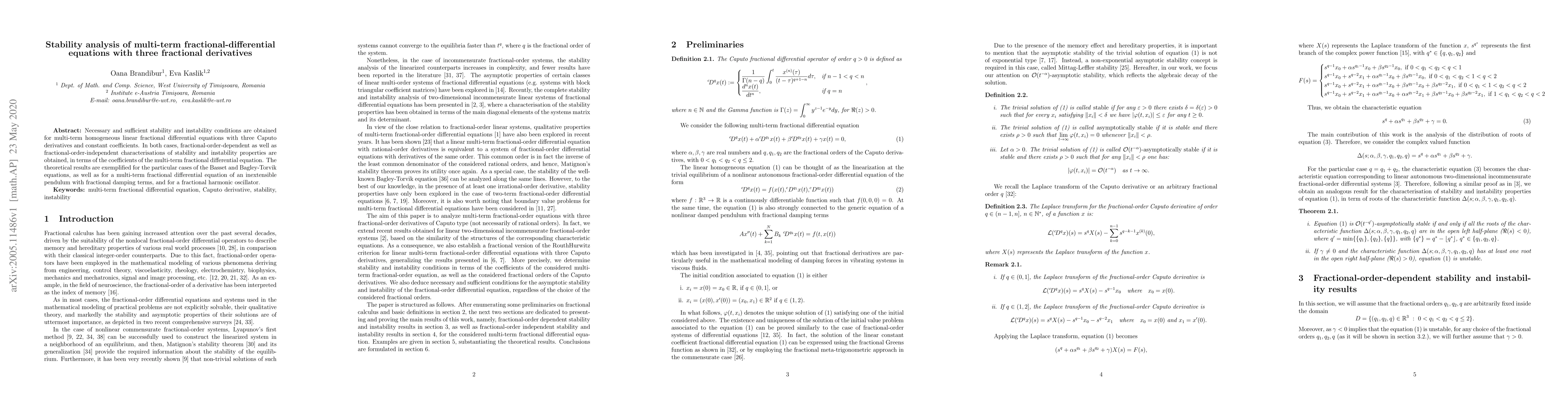 This paper derives necessary and sufficient stability conditions for multi-term fractional differential equations with three Caputo derivatives and constant coefficients. It provides both fractional-order-dependent and independent stability characterizations, illustrated through examples like the Basset, Bagley-Torvik equations, and a fractional pendulum.