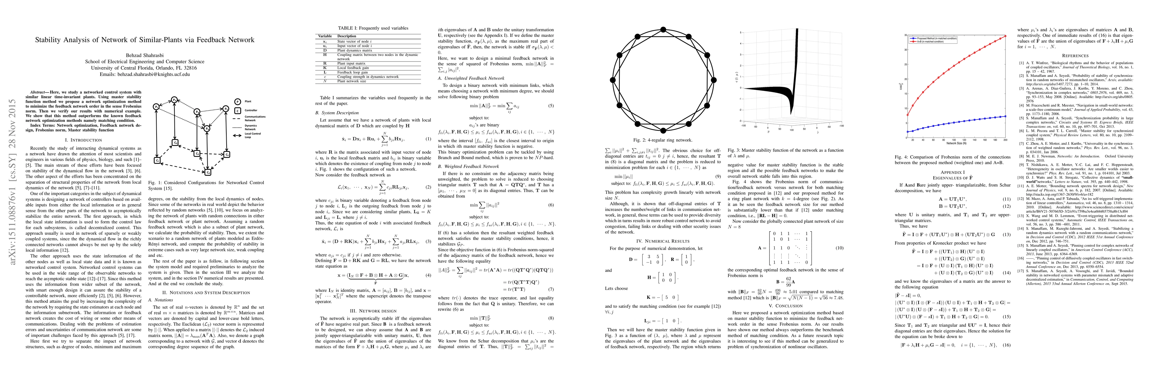 Here, we study a networked control system with similar linear time-invariant plants. Using master stability function method we propose a network optimization method to minimize the feedback network order in the sense Frobenius norm. Then we verify our results with numerical example. We show that this method outperforms the known feedback network optimization methods namely matching condition.