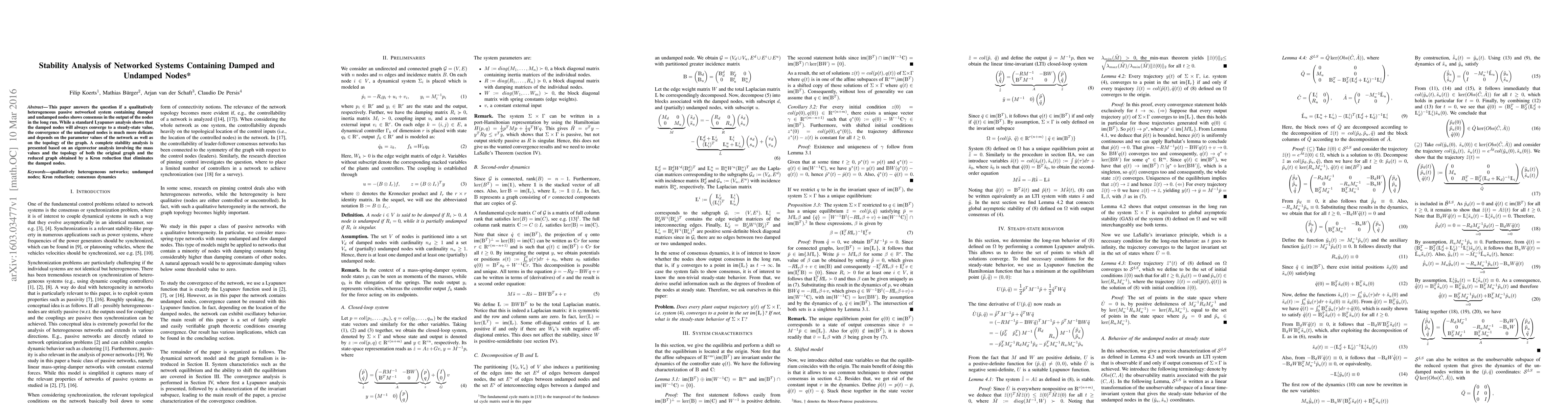 This paper answers the question if a qualitatively heterogeneous passive networked system containing damped and undamped nodes shows consensus in the output of the nodes in the long run. While a standard Lyapunov analysis shows that the damped nodes will always converge to a steady-state value, the convergence of the undamped nodes is much more delicate and depends on the parameter values of the network as well as on the topology of the graph. A complete stability analysis is presented based on an eigenvector analysis involving the mass values and the topology of both the original graph and the reduced graph obtained by a Kron reduction that eliminates the damped nodes.