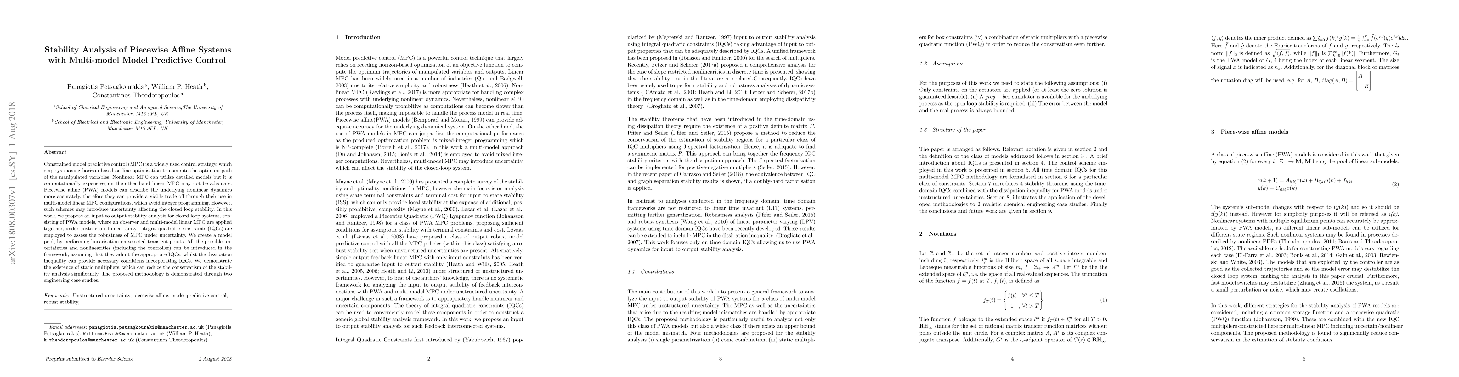 This paper proposes an input to output stability analysis for piecewise affine systems using multi-model linear model predictive control under unstructured uncertainty. It employs integral quadratic constraints to assess robustness and demonstrates the methodology through two engineering case studies.