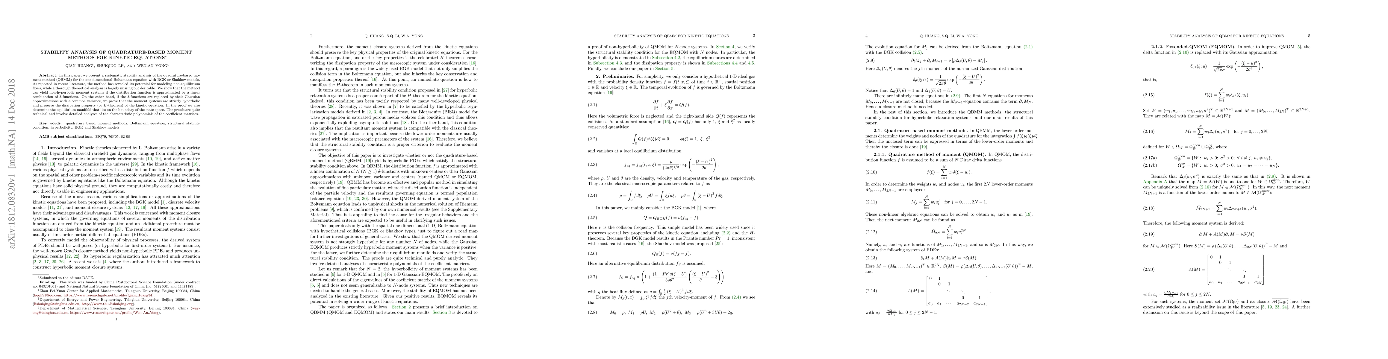 This paper conducts a stability analysis of the quadrature-based moment method (QBMM) for the Boltzmann equation, demonstrating that Gaussian approximations yield strictly hyperbolic moment systems that preserve the kinetic equation's dissipation property, while $\delta$-function approximations can lead to non-hyperbolic systems. Technical proofs involve detailed characteristic polynomial analysis.
