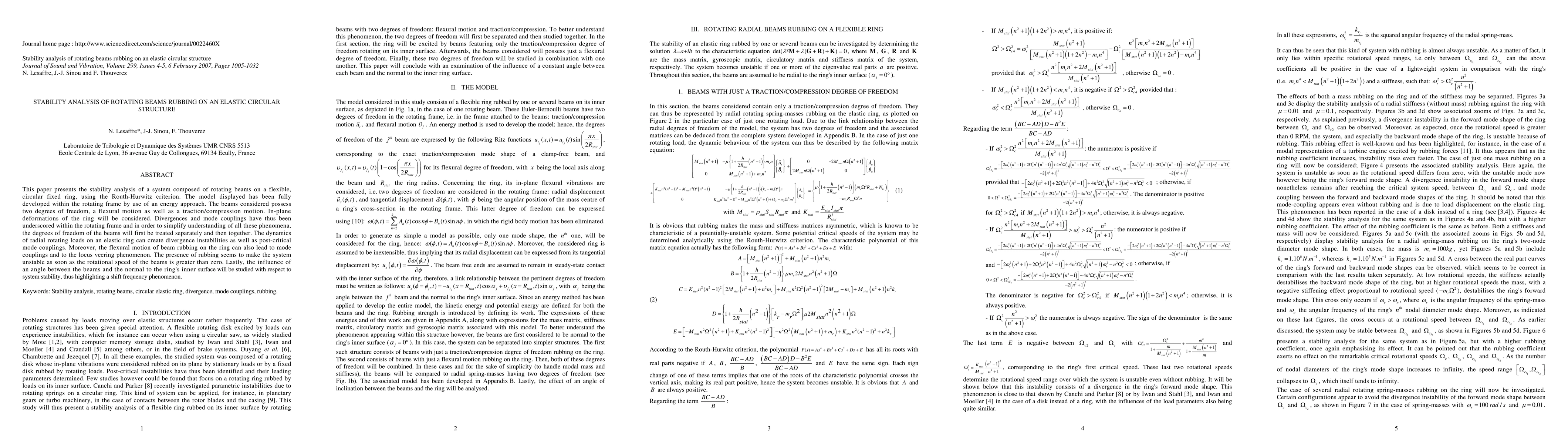 Researchers analyzed the stability of rotating beams on an elastic circular structure, finding that even slight rotation can make the system unstable. They also identified a shift frequency phenomenon influenced by beam angle, which could help design more stable systems.