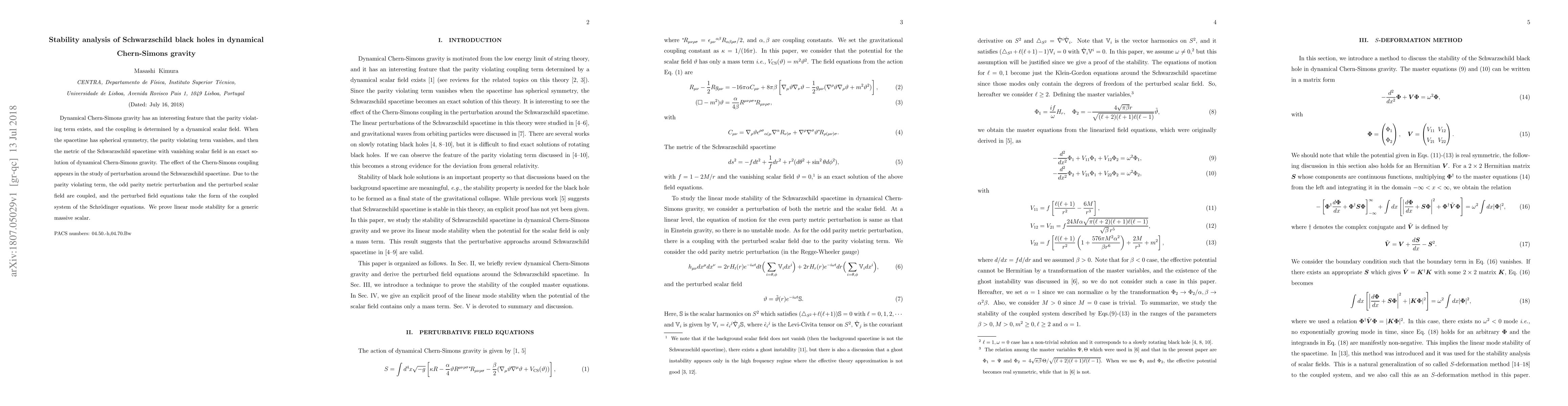 This paper investigates the stability of Schwarzschild black holes within the framework of dynamical Chern-Simons gravity, demonstrating that the parity-violating term leads to a coupled system of Schrödinger-like equations for odd parity perturbations. The study proves linear mode stability for a generic massive scalar in this context.
