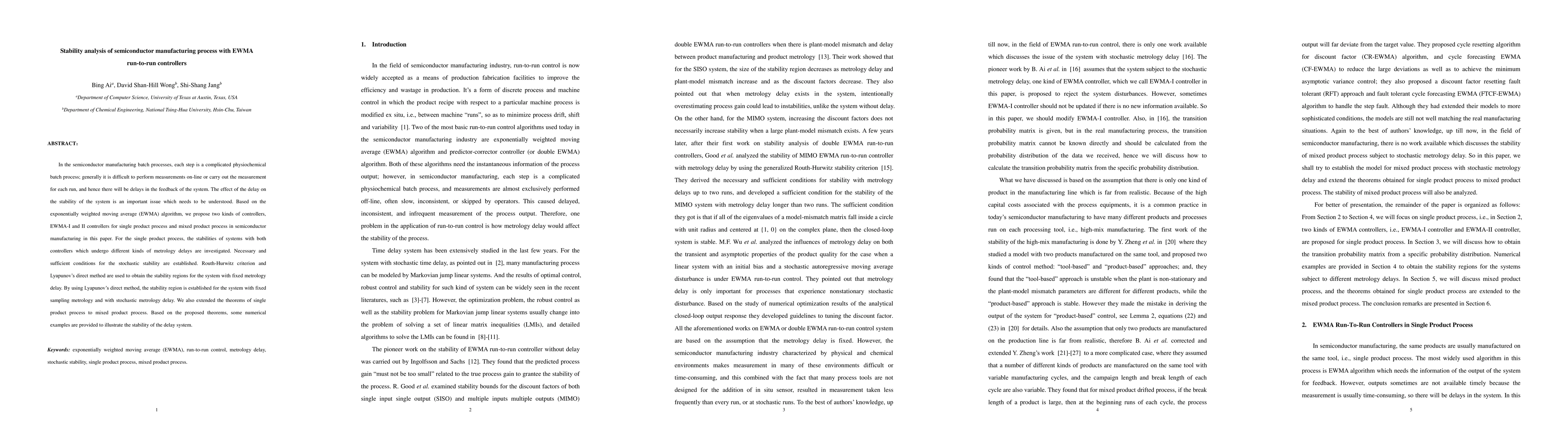 This paper proposes EWMA-I and EWMA-II controllers for semiconductor manufacturing processes, analyzing stability under various metrology delays. It establishes conditions for stochastic stability using the Routh-Hurwitz criterion and Lyapunov's direct method, and extends the findings to mixed product processes with numerical examples.